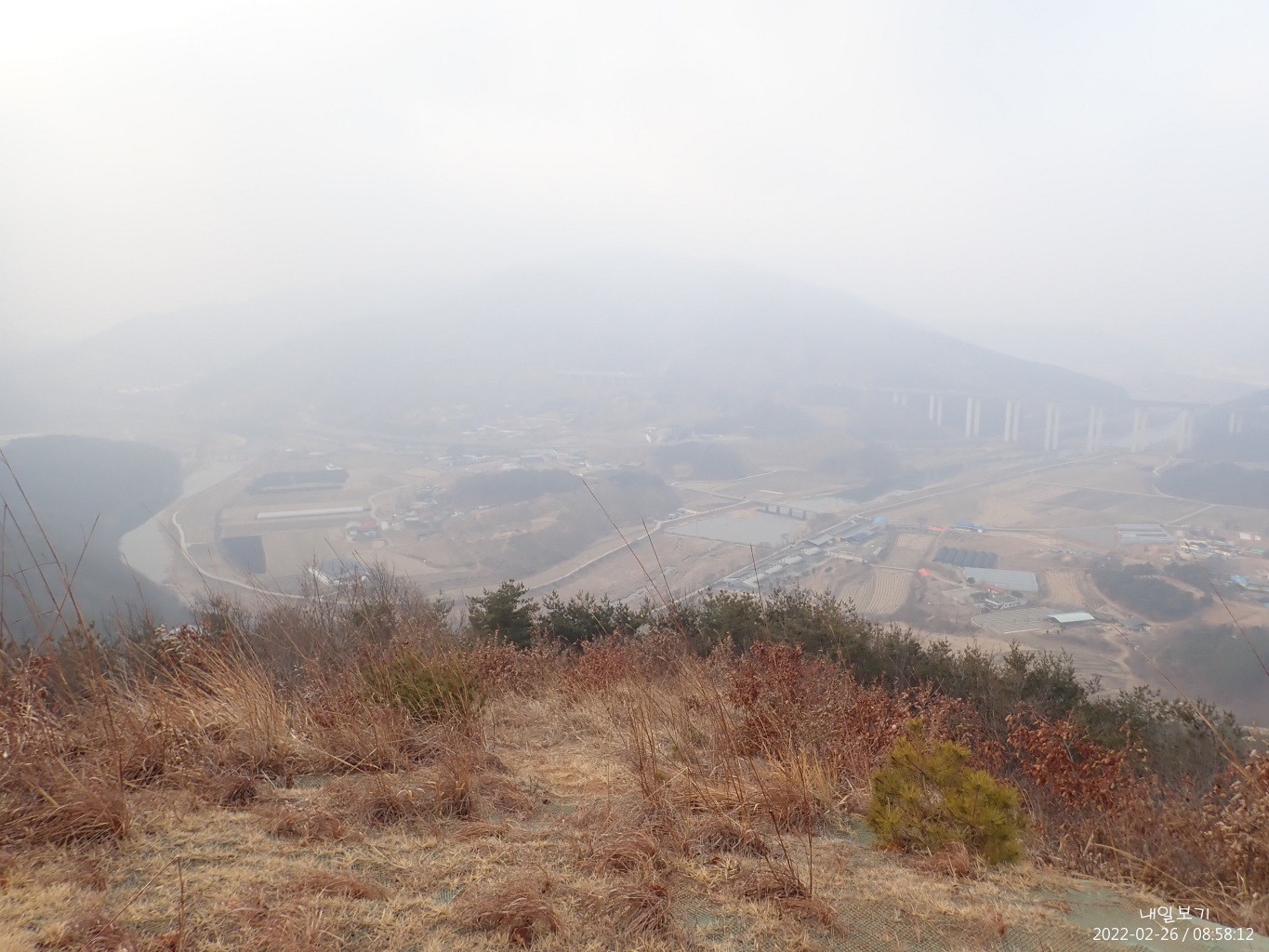 유구천이 휘돌아가는 사곡면 해월리 마을과 오른쪽 당진대전고속도로 교각.