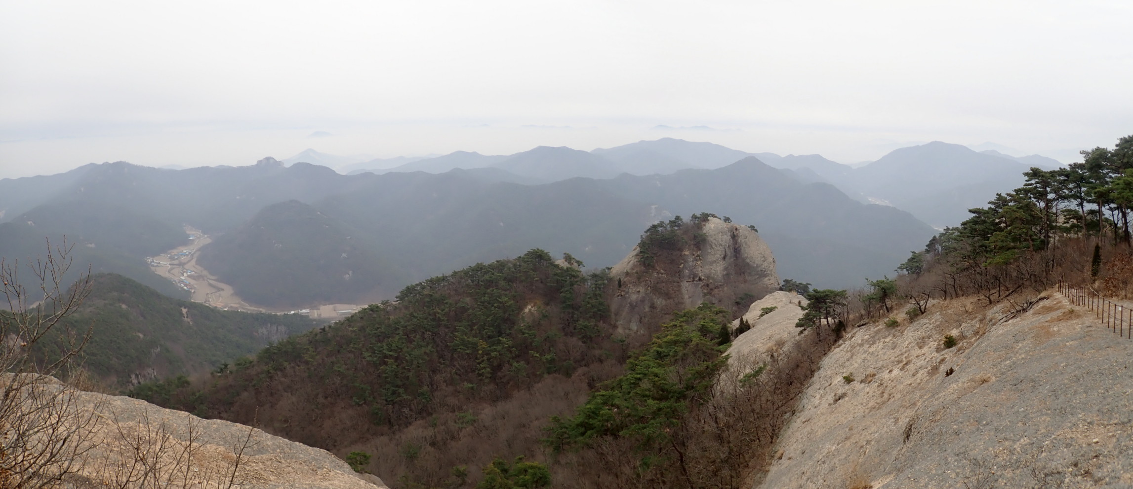 전망바위에서 오른쪽(남동쪽). 가운데 입석리, 오른쪽 평평바위와 지나온 상여봉.