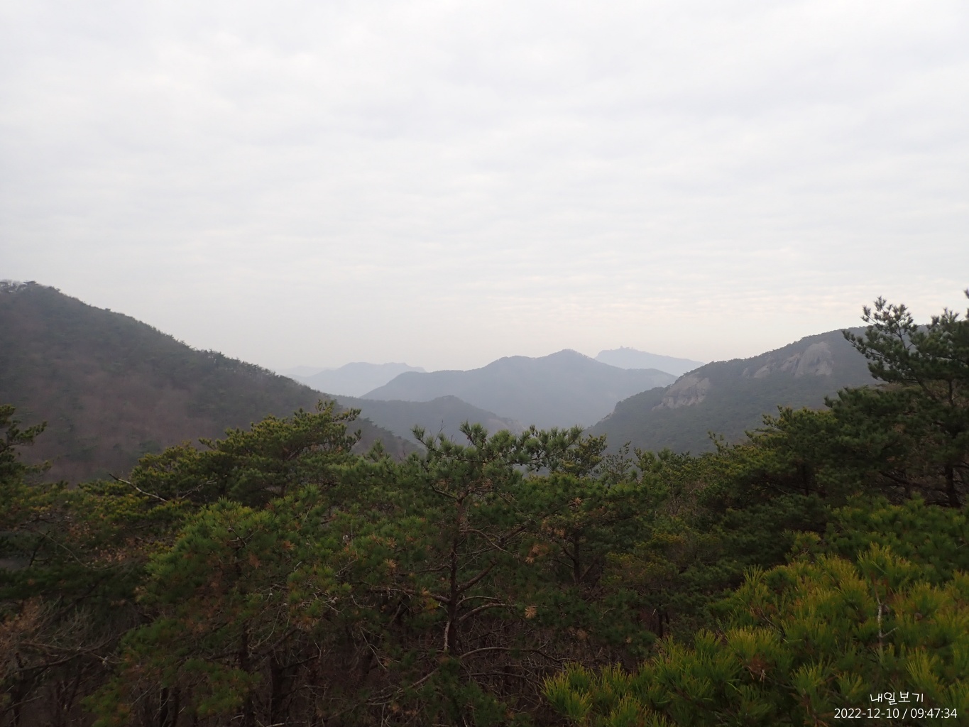남서쪽. 왼쪽 뾰족한 주산, 개암제, 가운데 멀리 노승봉과 우금바위.