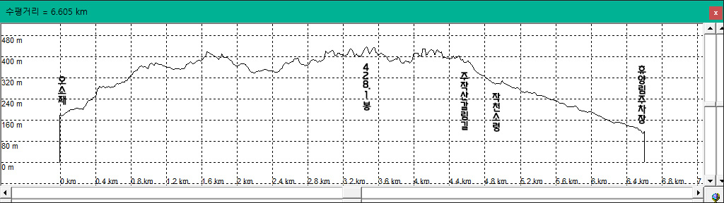 대전에서 7시 출발한 버스가 11시 5분 오소재에 도착했다.
