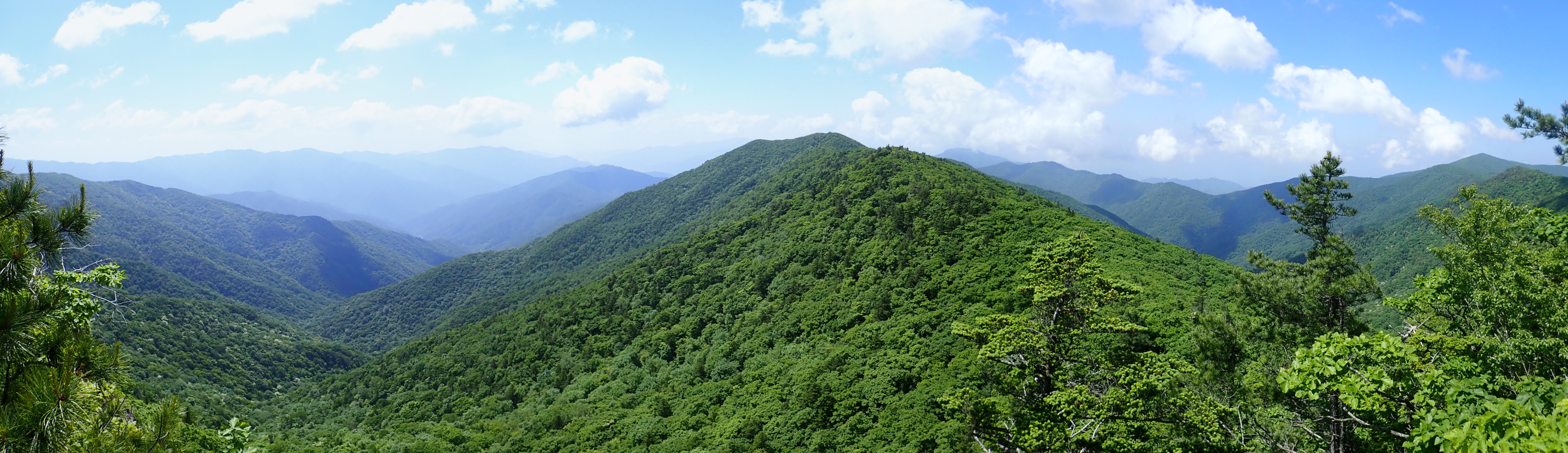 갈림길 오른쪽 전망바위에서 좌중간 불무장등, 그 오른쪽1350.2봉, 가운데 질등, 뒤에 문바우등(?).