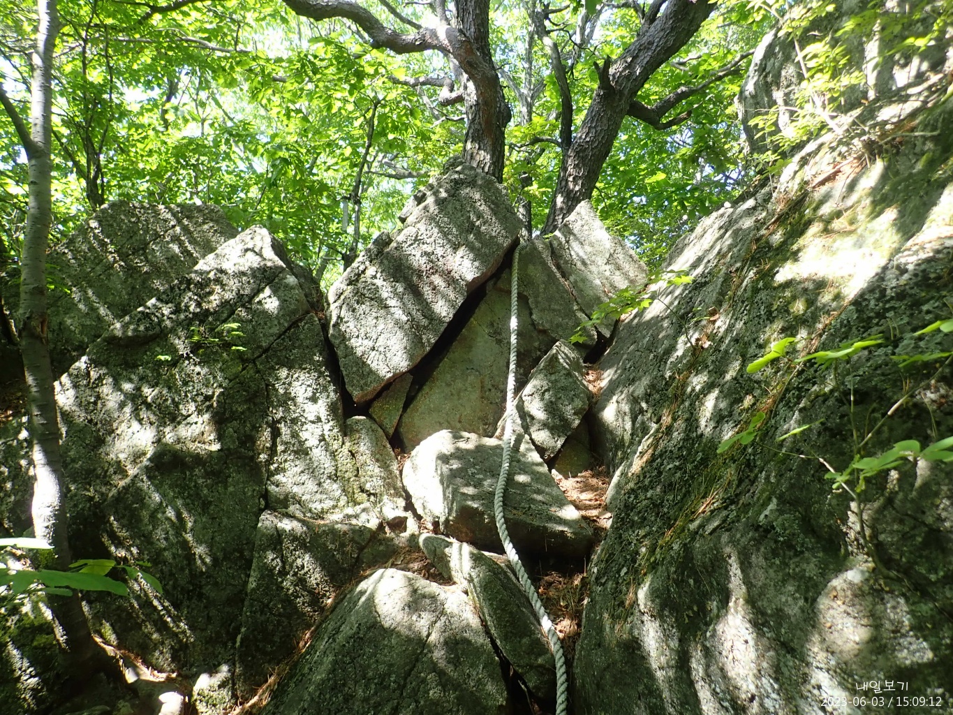 날머리로 내려서는 길은 로프를 붙잡고 내려설 정도의 급경사.
