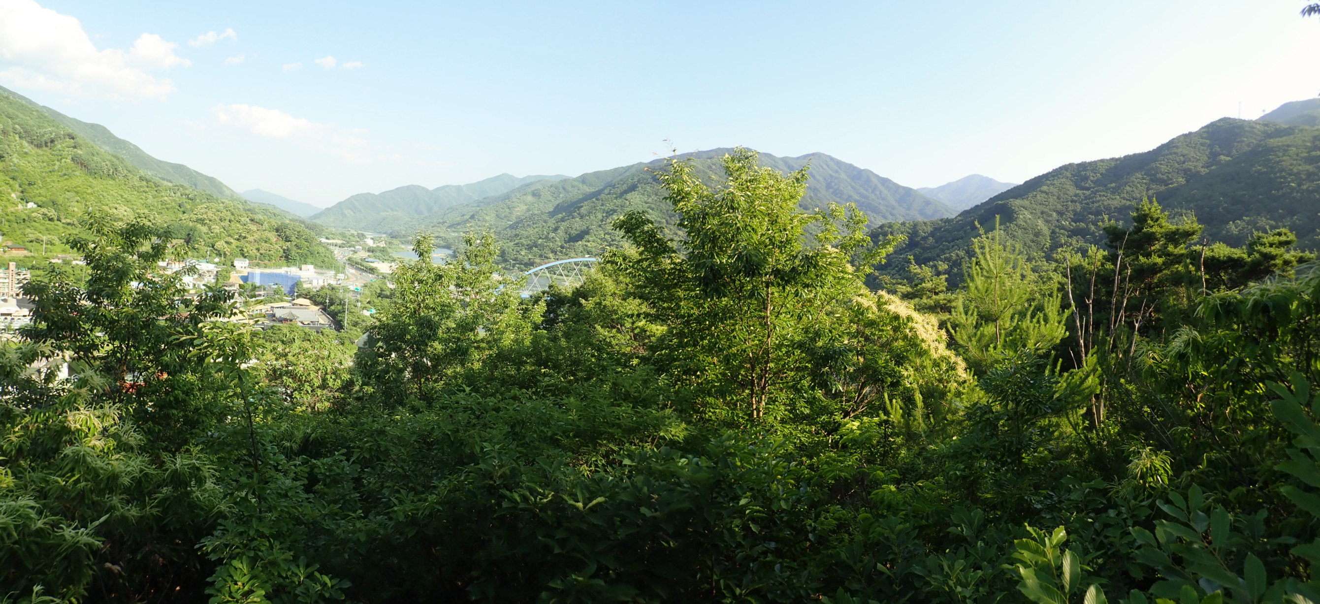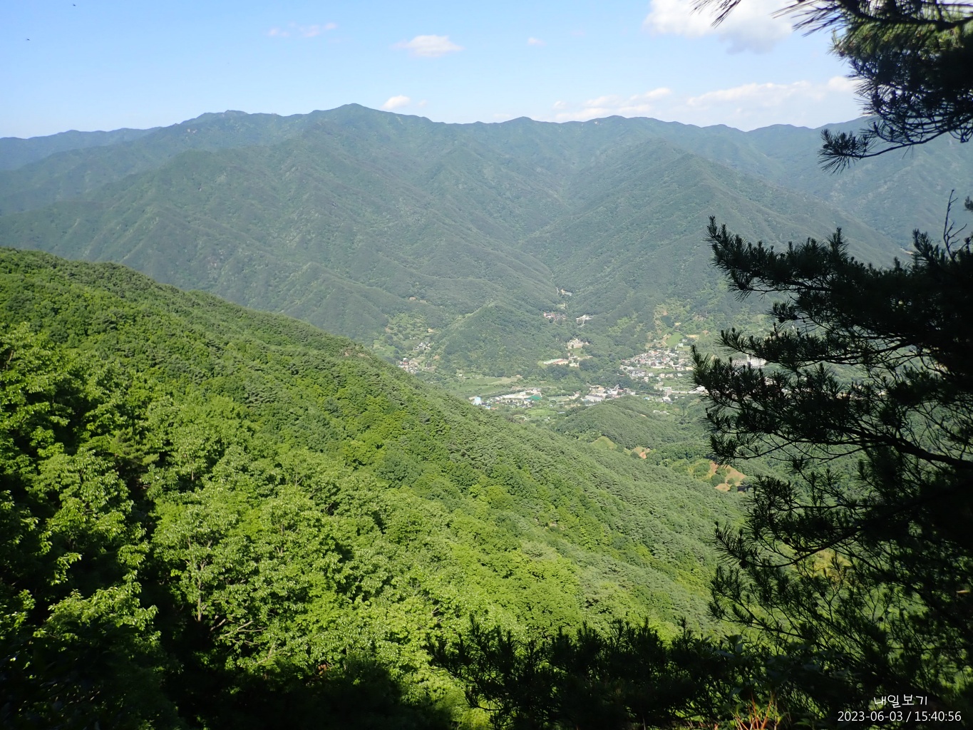 건너편 산줄기는 삼신봉에서 남서쪽으로 뻣은 청학봉-형제봉 능선.