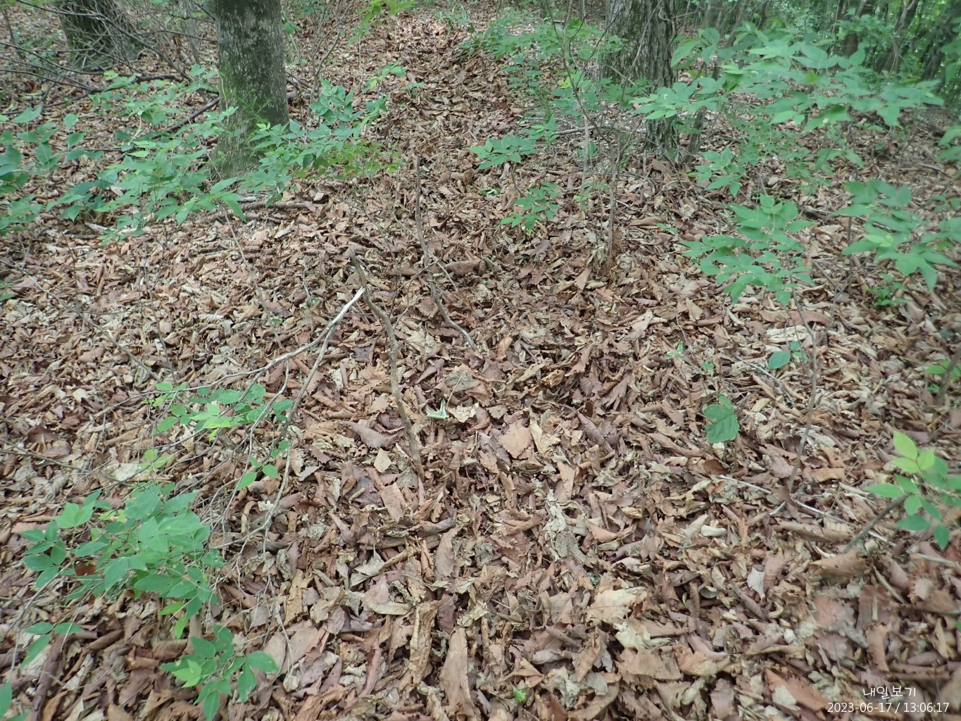 돼지령에서 내려오는 능선과 맞나기 전에 약간의 너덜과 산죽을 헤쳐왔다.