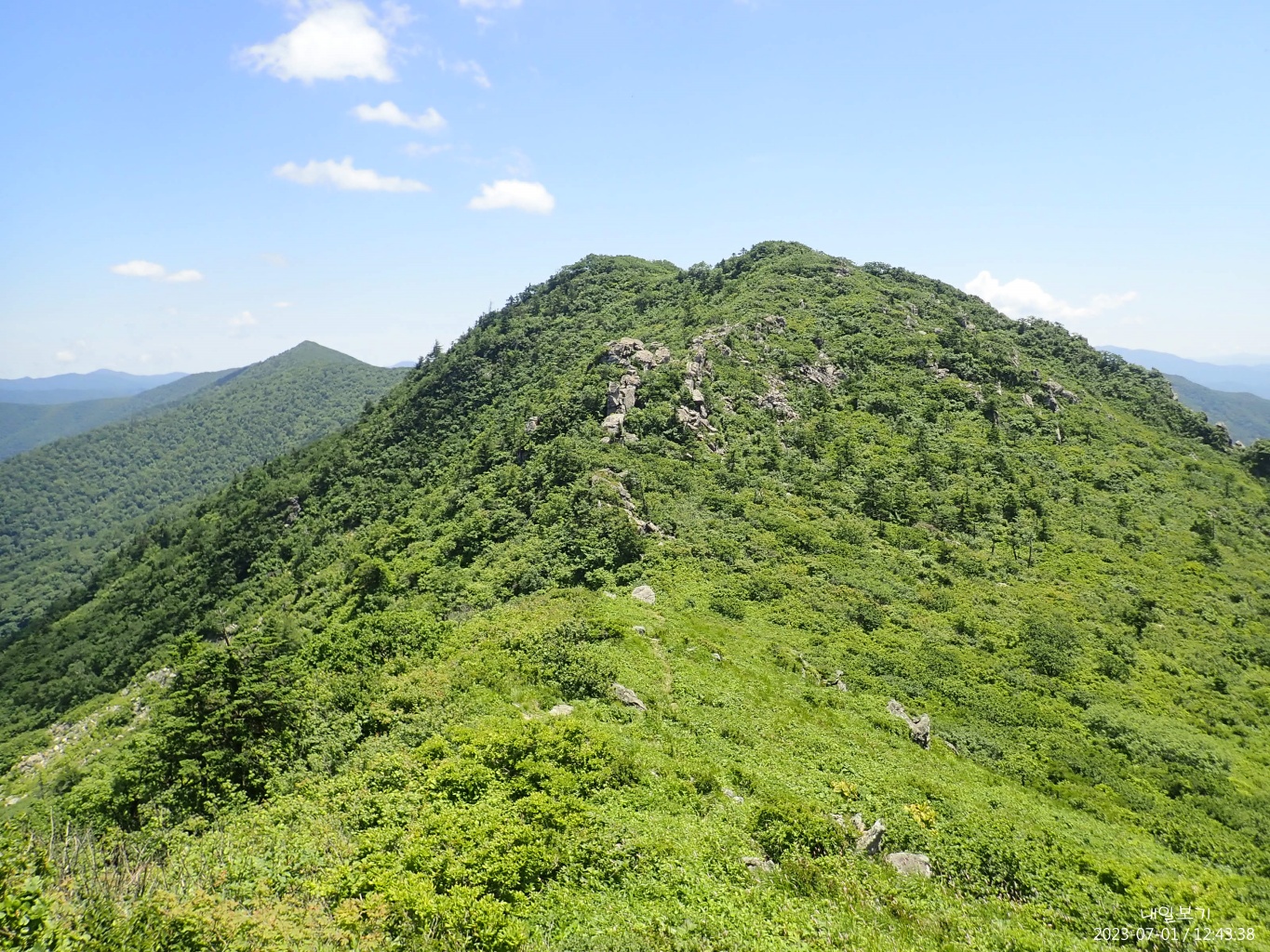 북동쪽 조망. 가까이 배달은석 암봉(1415m)과 오른쪽 주억봉.