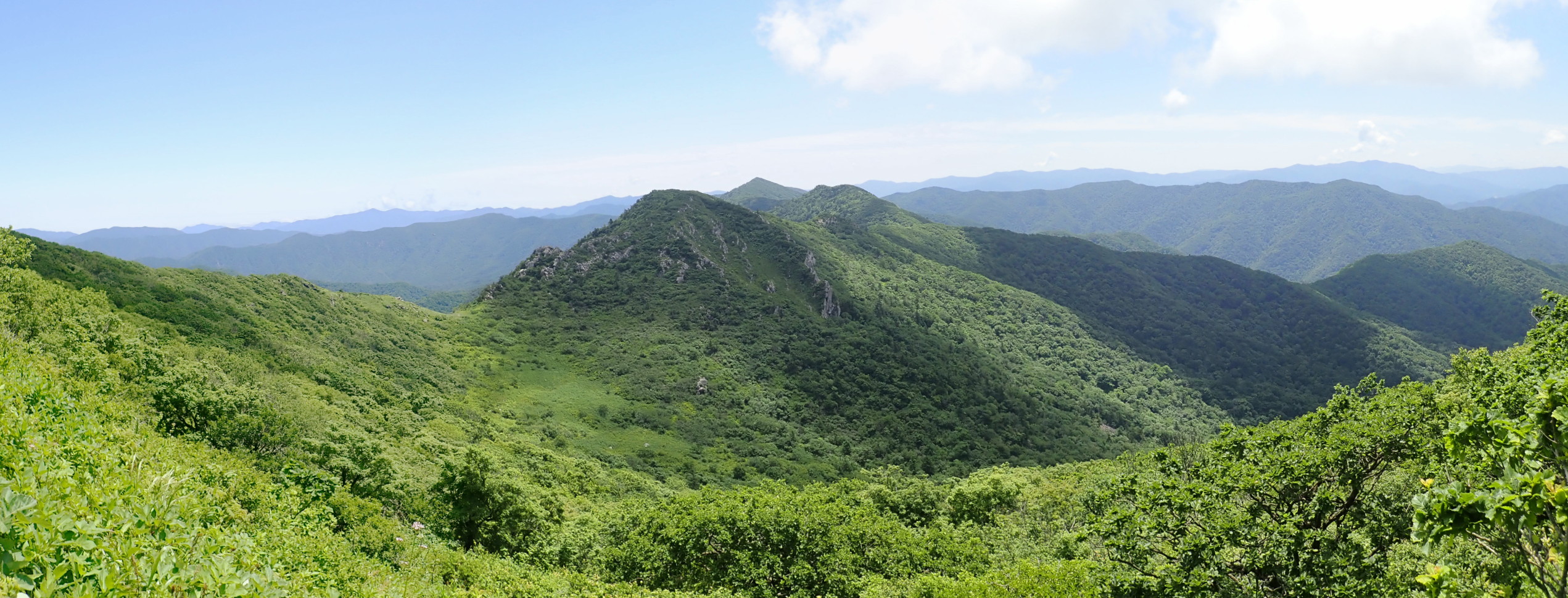 북동쪽. 왼쪽 멀리 설악산에서 오른쪽으로 이어지는 백두대간.