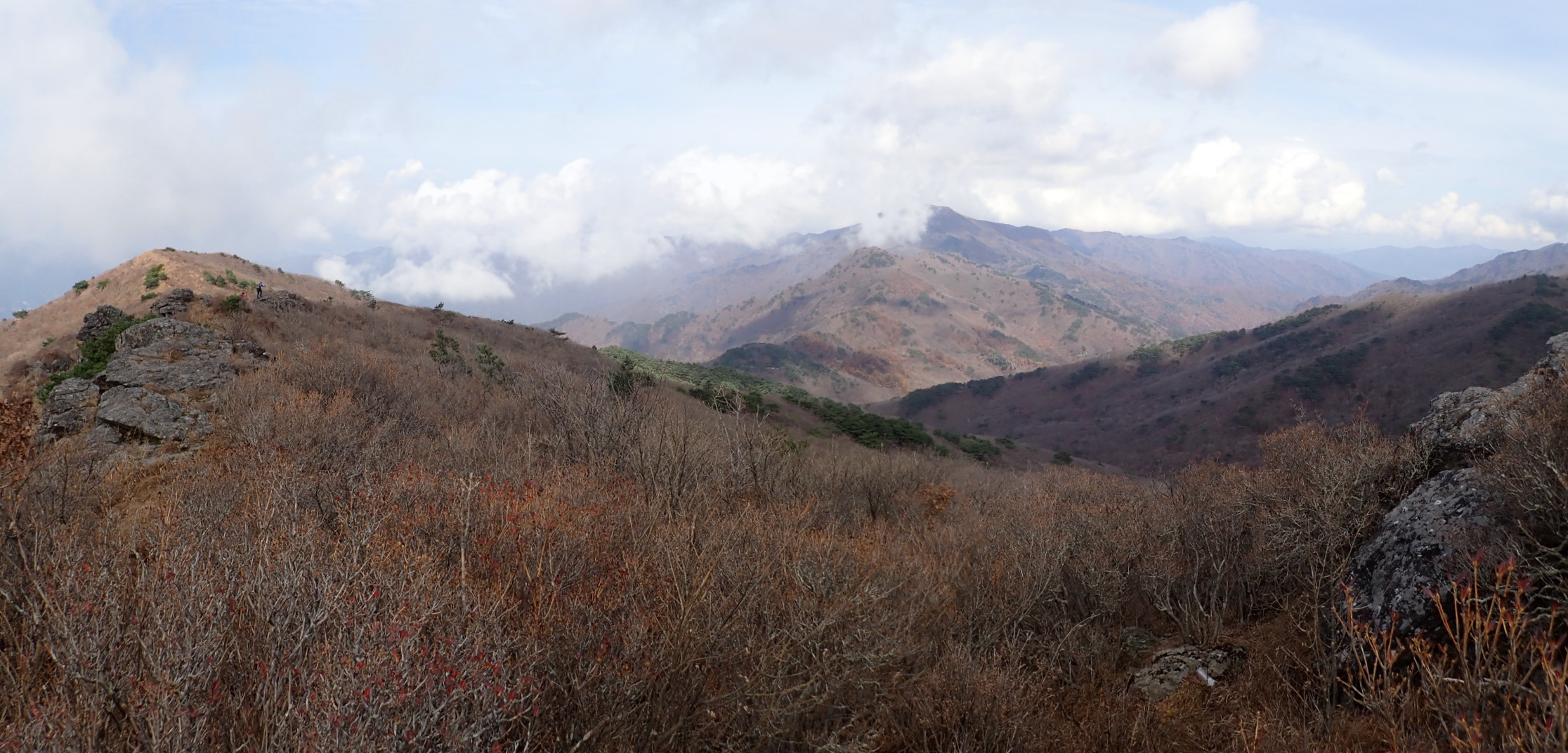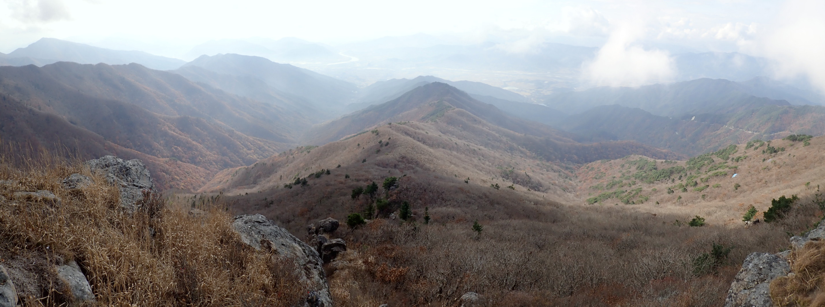 동쪽. 좌중간 멀리 반야봉과 가운데 노고단, 오른쪽 멀리 영신봉과 촛대봉인 듯하다.