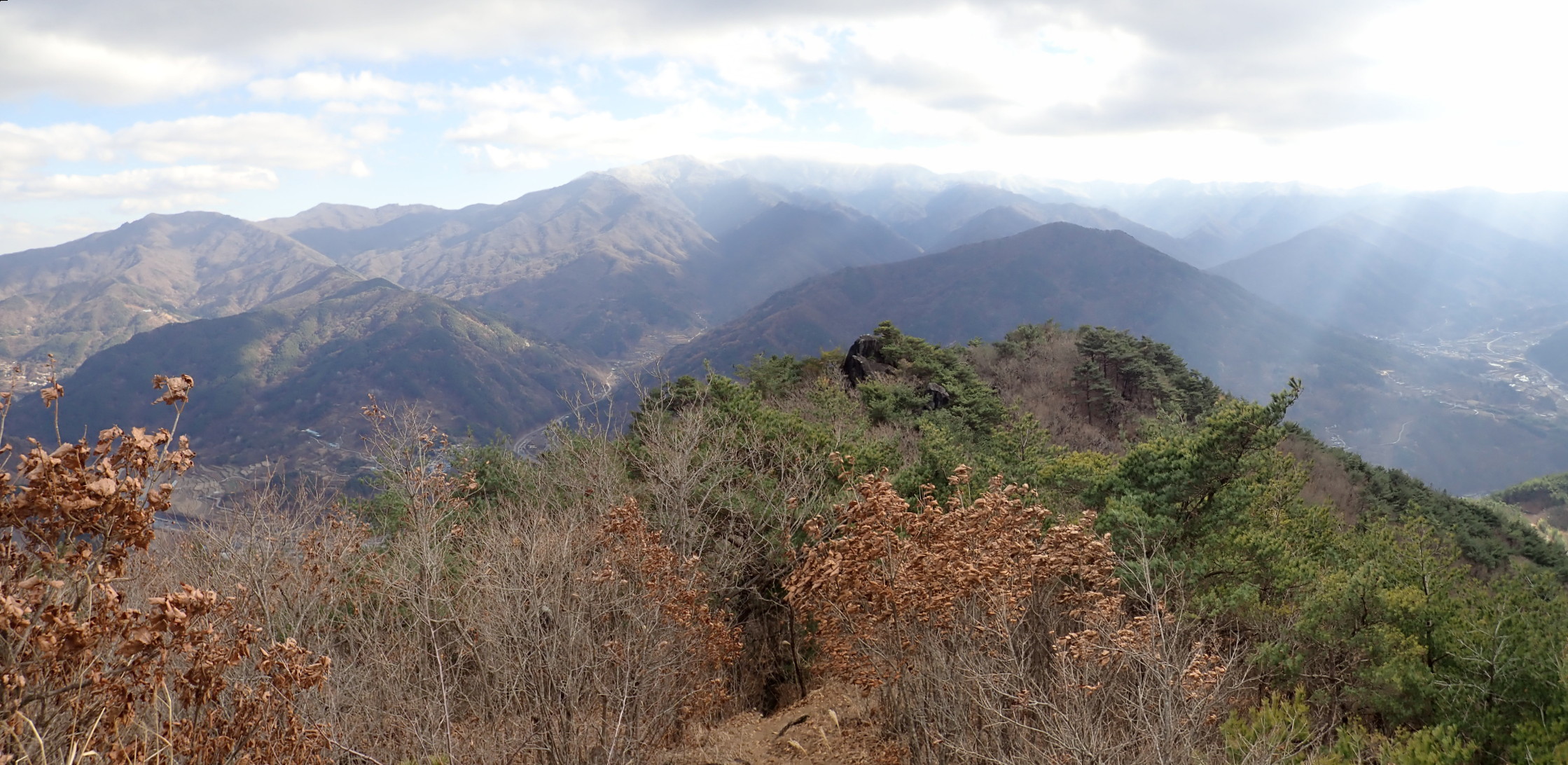 북동쪽. 가운데 함양 법화산과 왼쪽 오도재. 오른쪽 멀리 와불산.