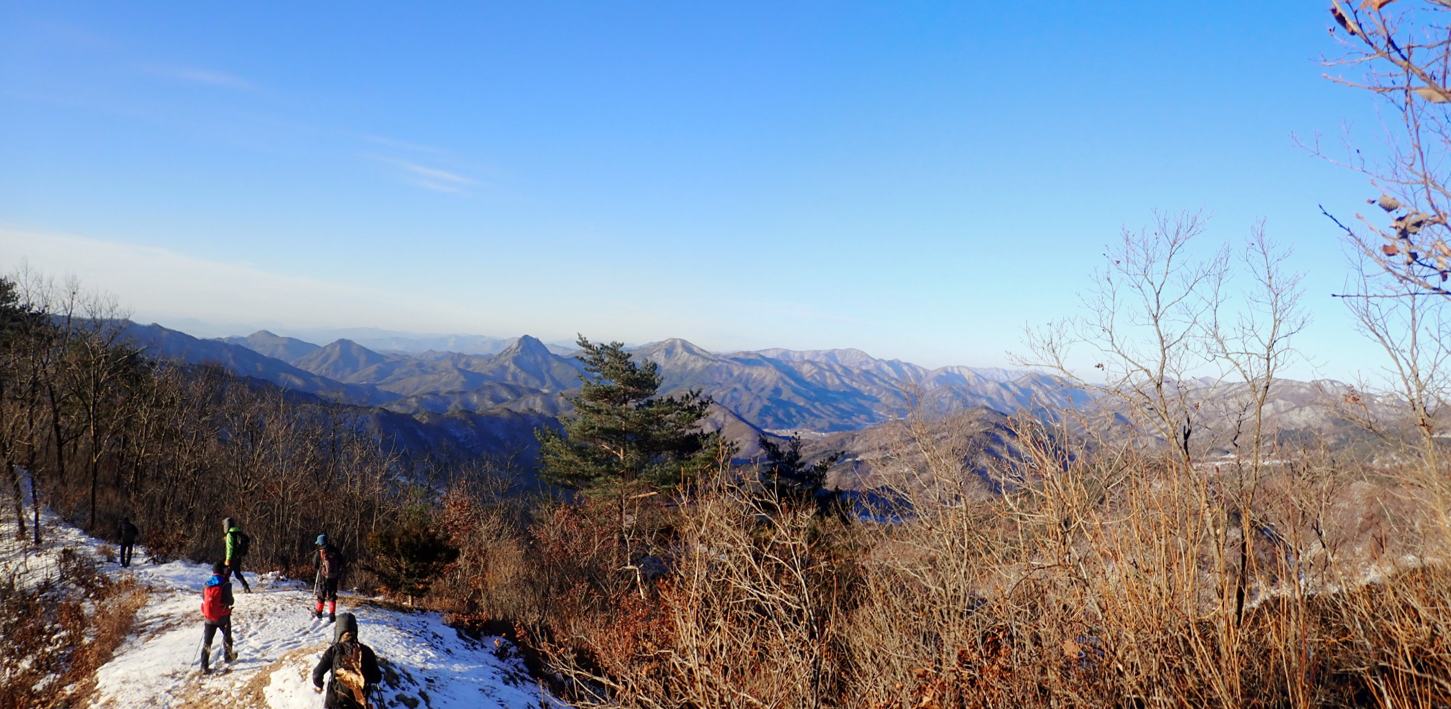왼쪽 지난 1구간에 올라서 천주봉을 봤던 654.2봉과 가운데 천주봉과 우중간 멀리 황장산.