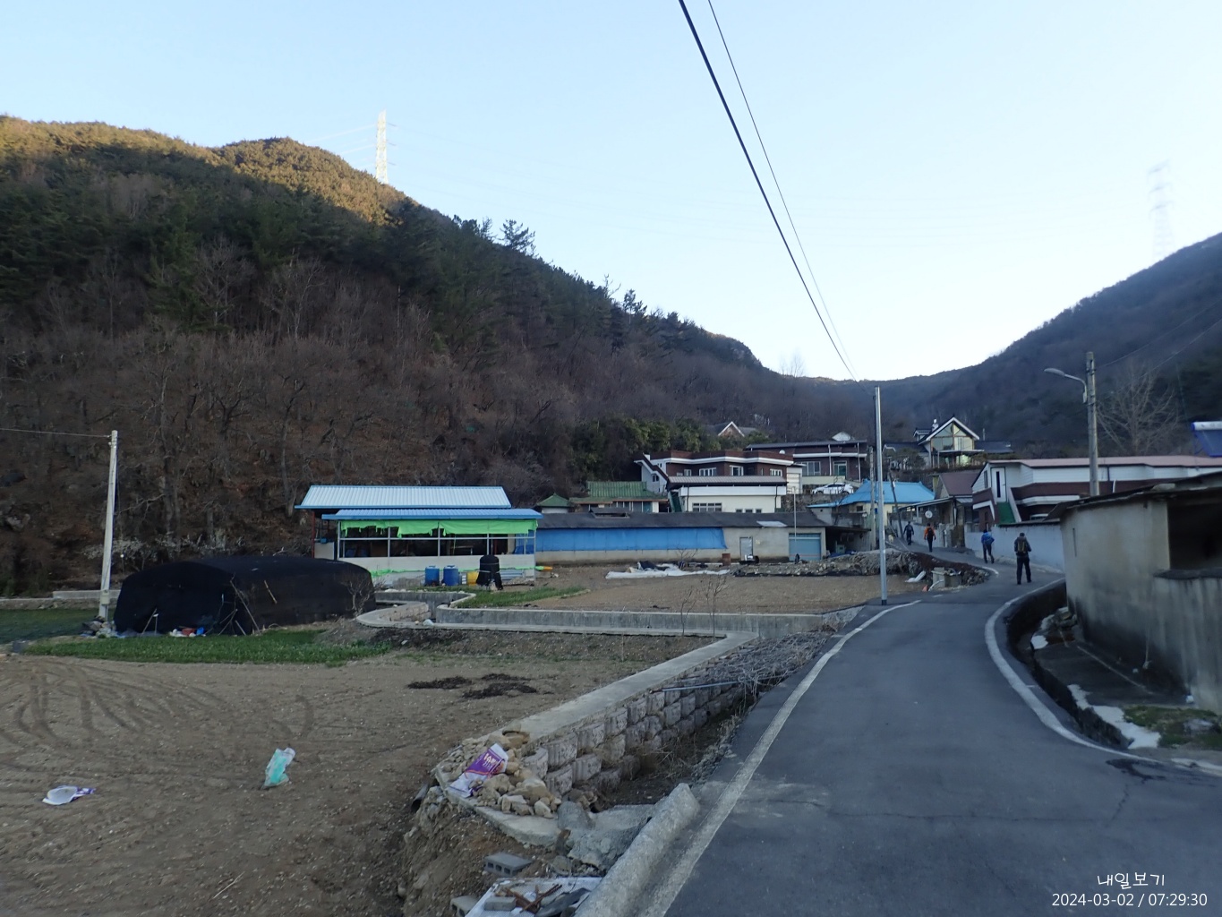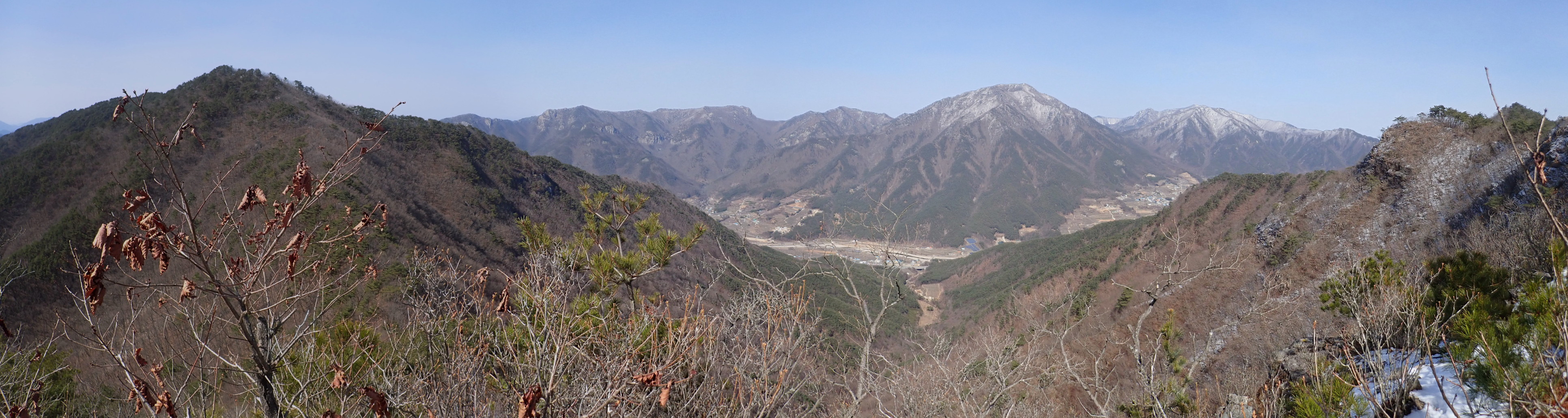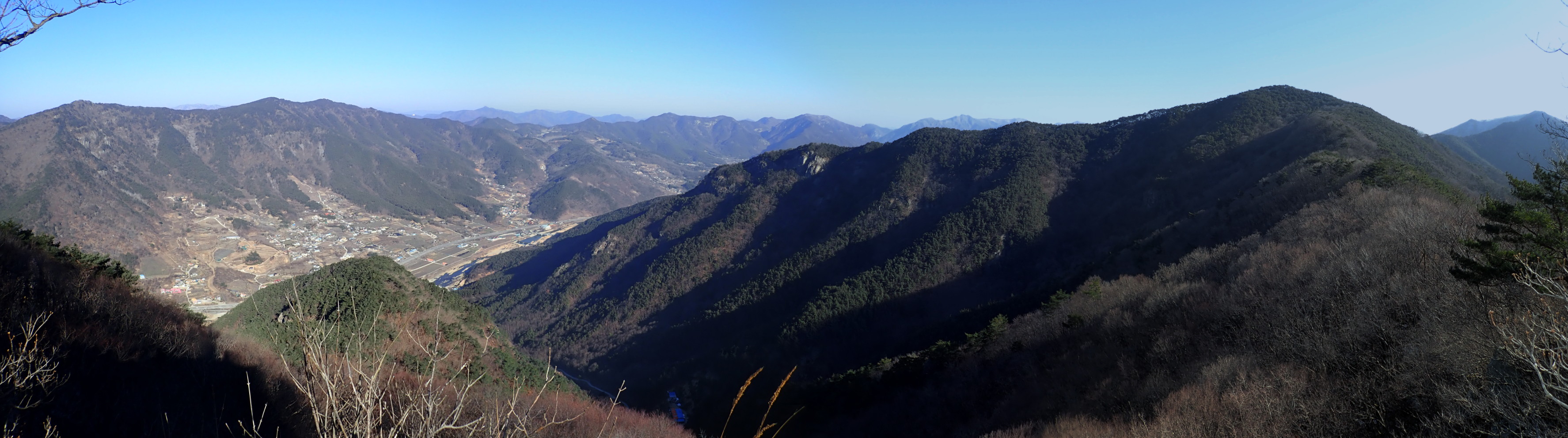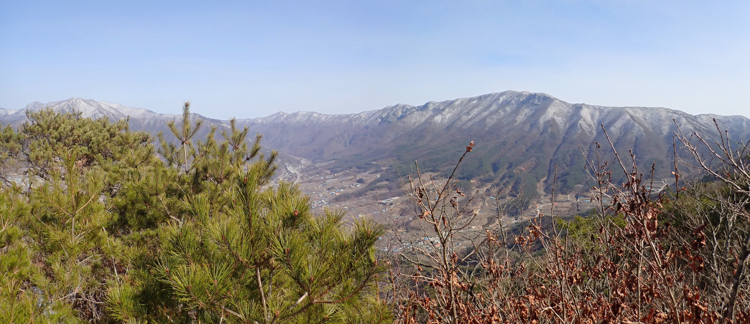 산내면 용전리마을과 좌중간 용암봉-오른쪽 멀리 정각산.