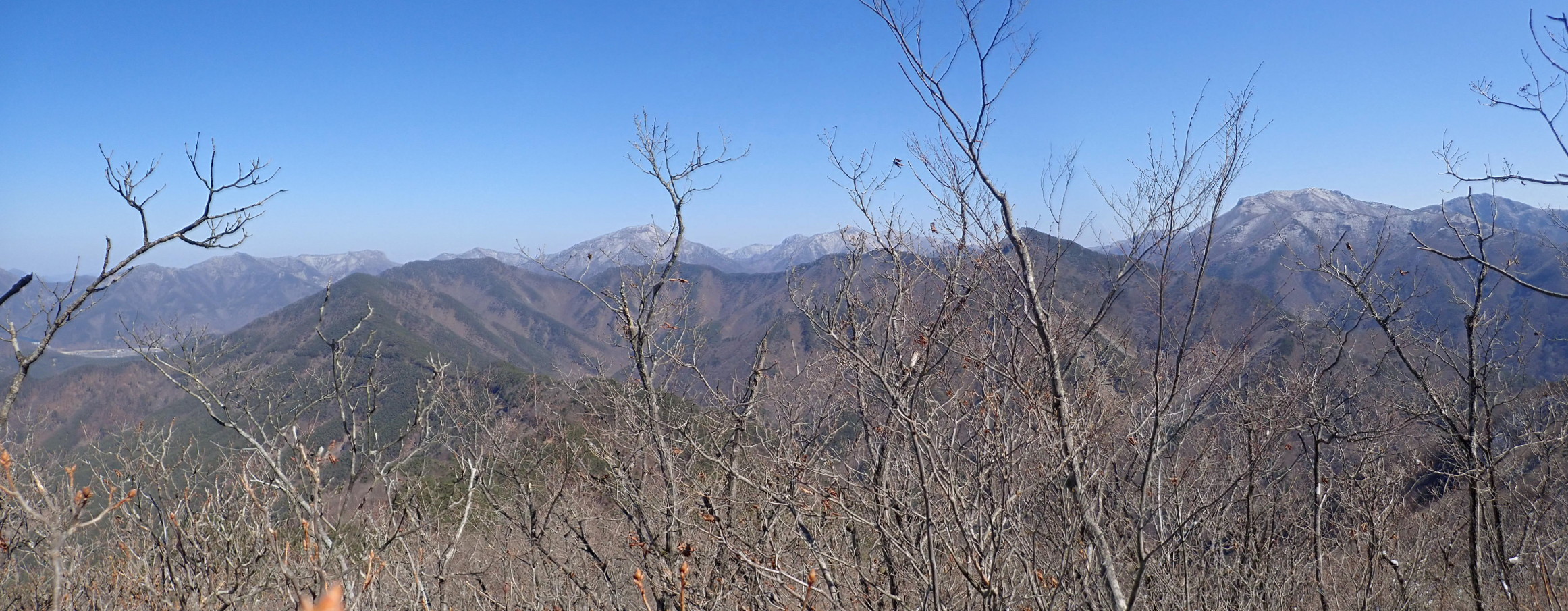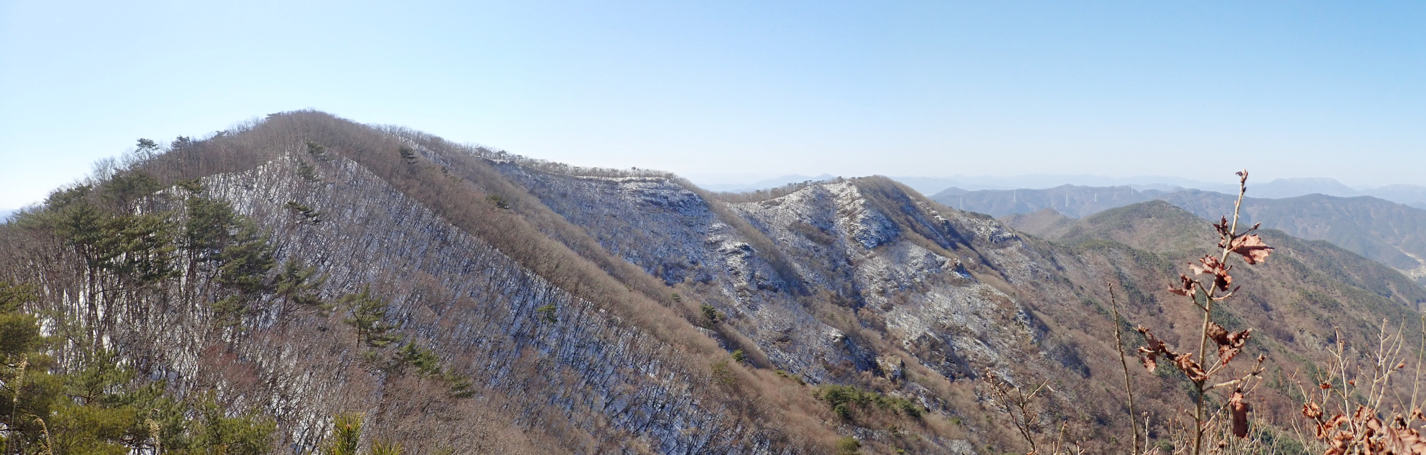 좌중간 953.6봉(깨진바위)-움푹 패인 팔풍재-억산-운문산-가지산. 오른쪽 소나무 왼쪽에 정승봉.