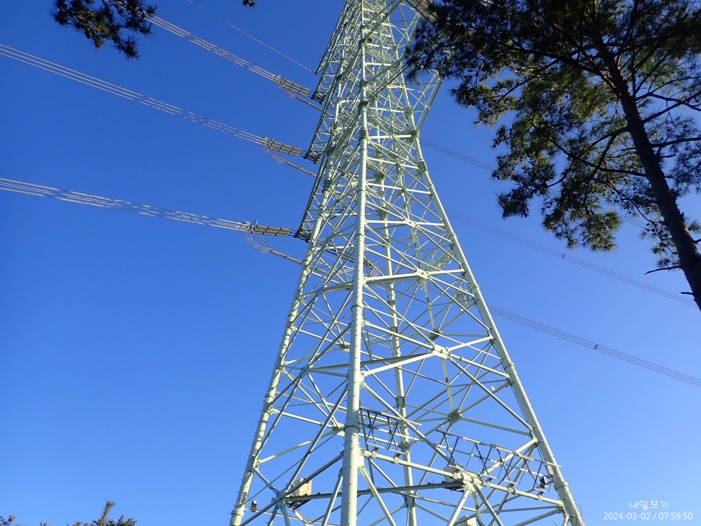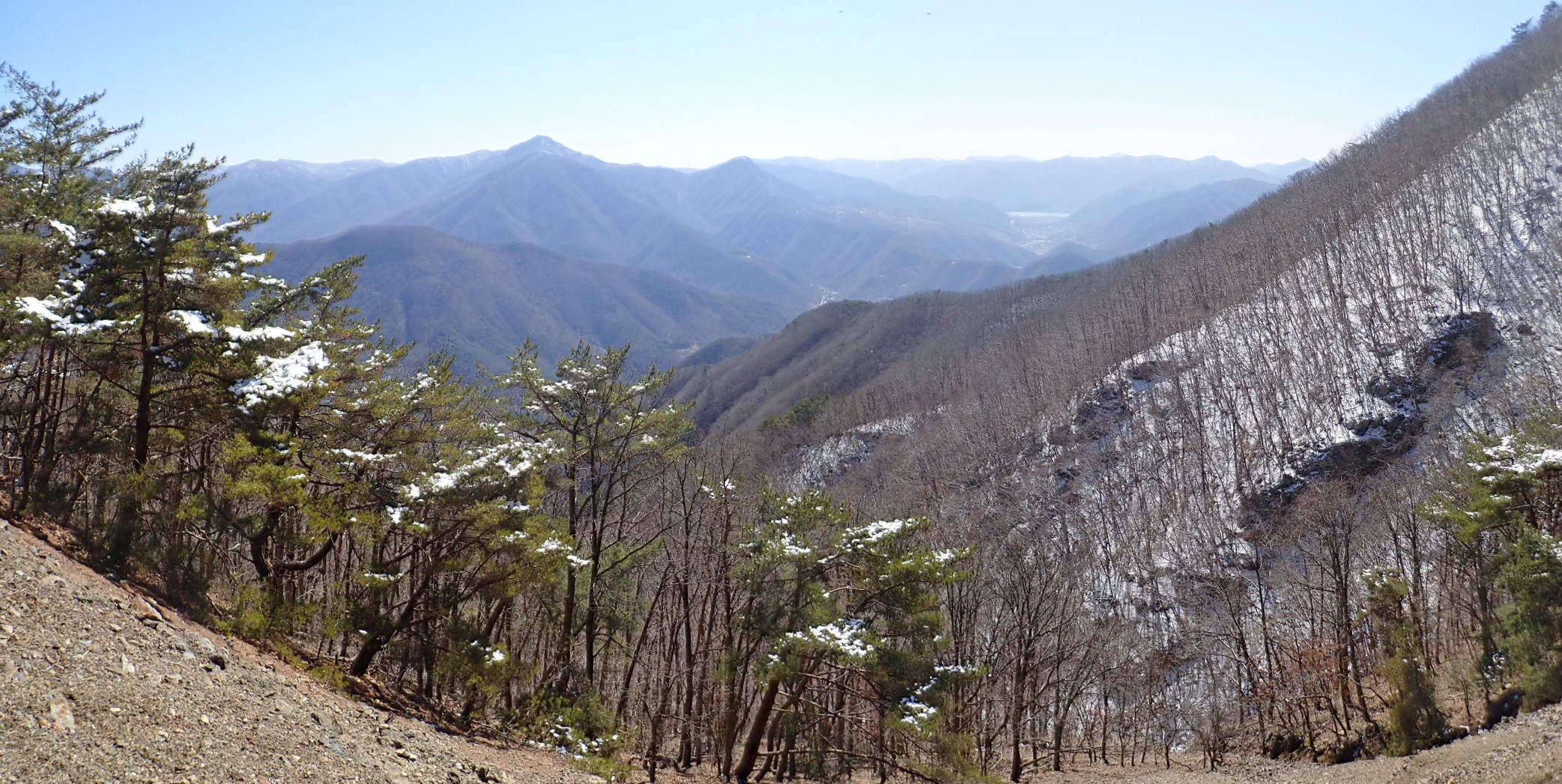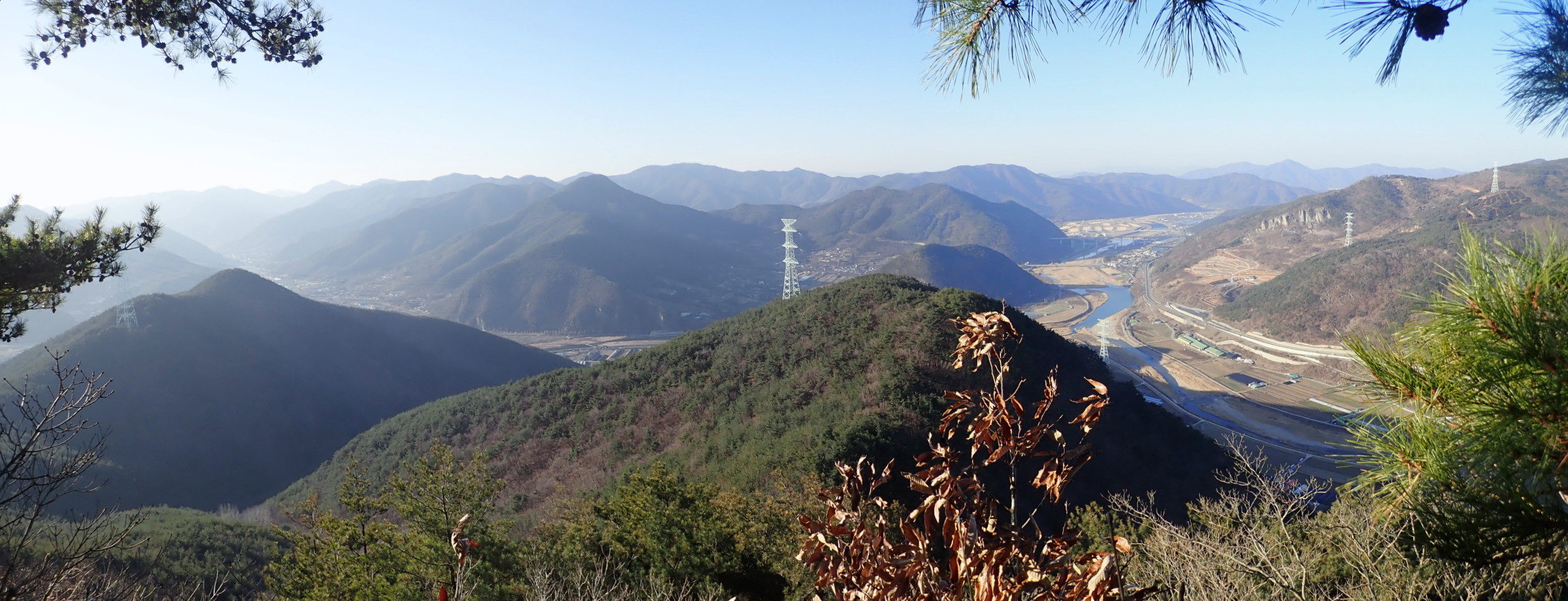 지나온 철탑 왼쪽에 가래봉과 오른쪽 경주산과 계령산. 밀양쪽으로 흐르는 단장천과 오른쪽 용암산.