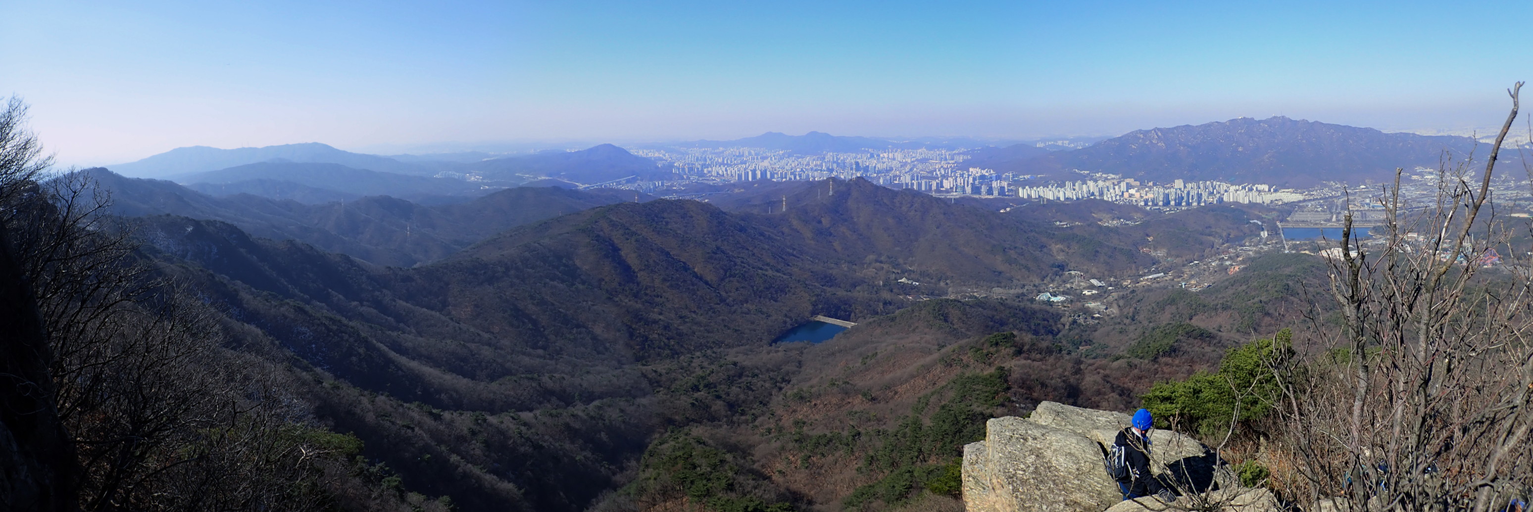 왼쪽 관악산과 서울대공원-가운데 서초구 우면산-우중간 매봉과 그 뒤에 송파구 롯데월드타워가 희미하게 보인다.