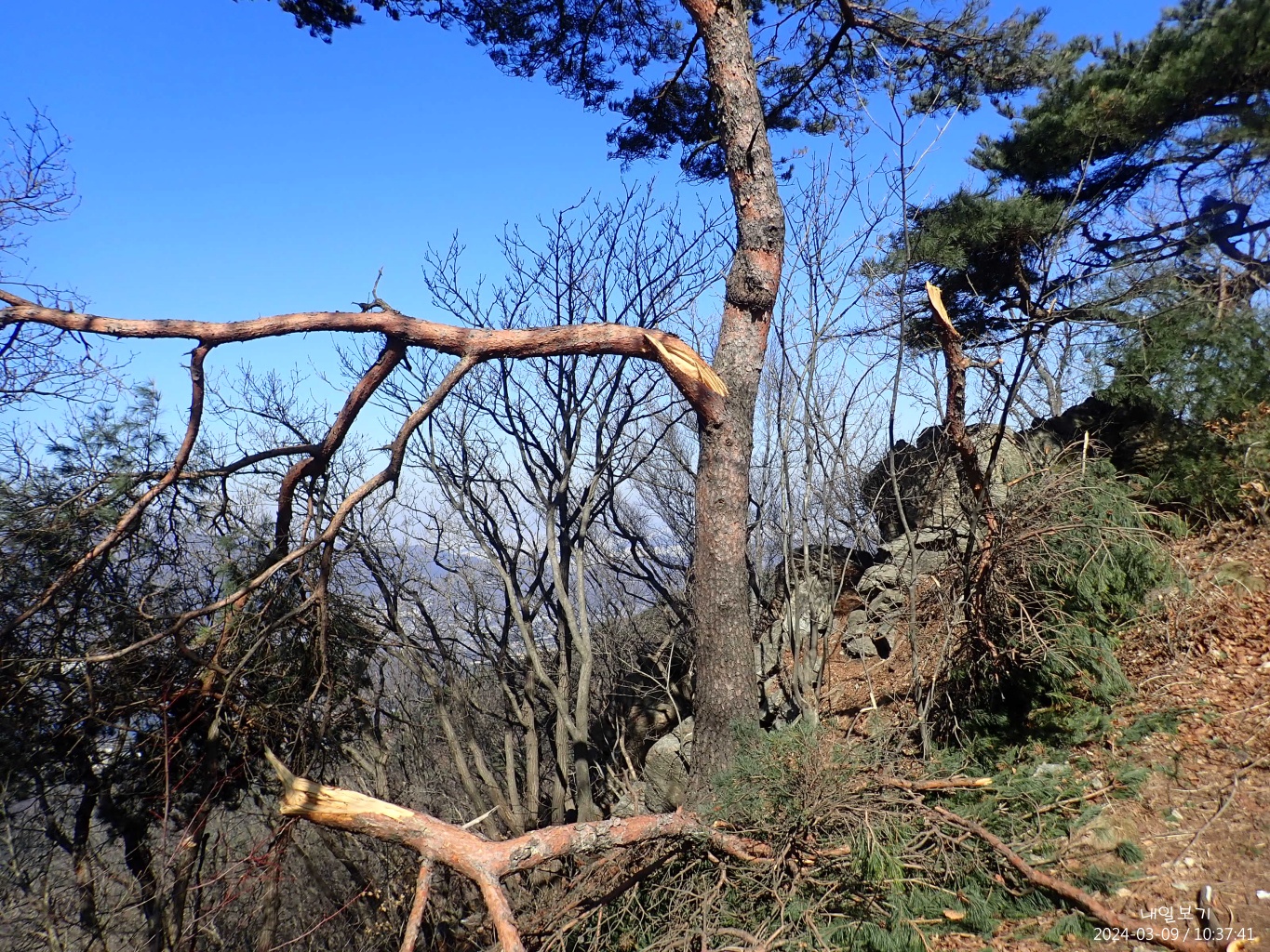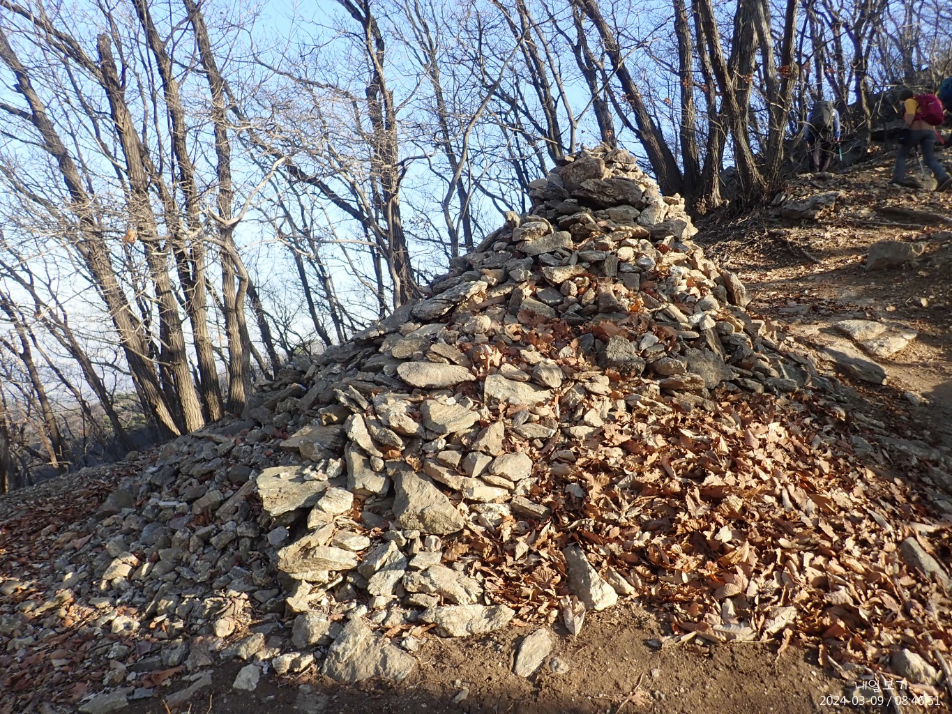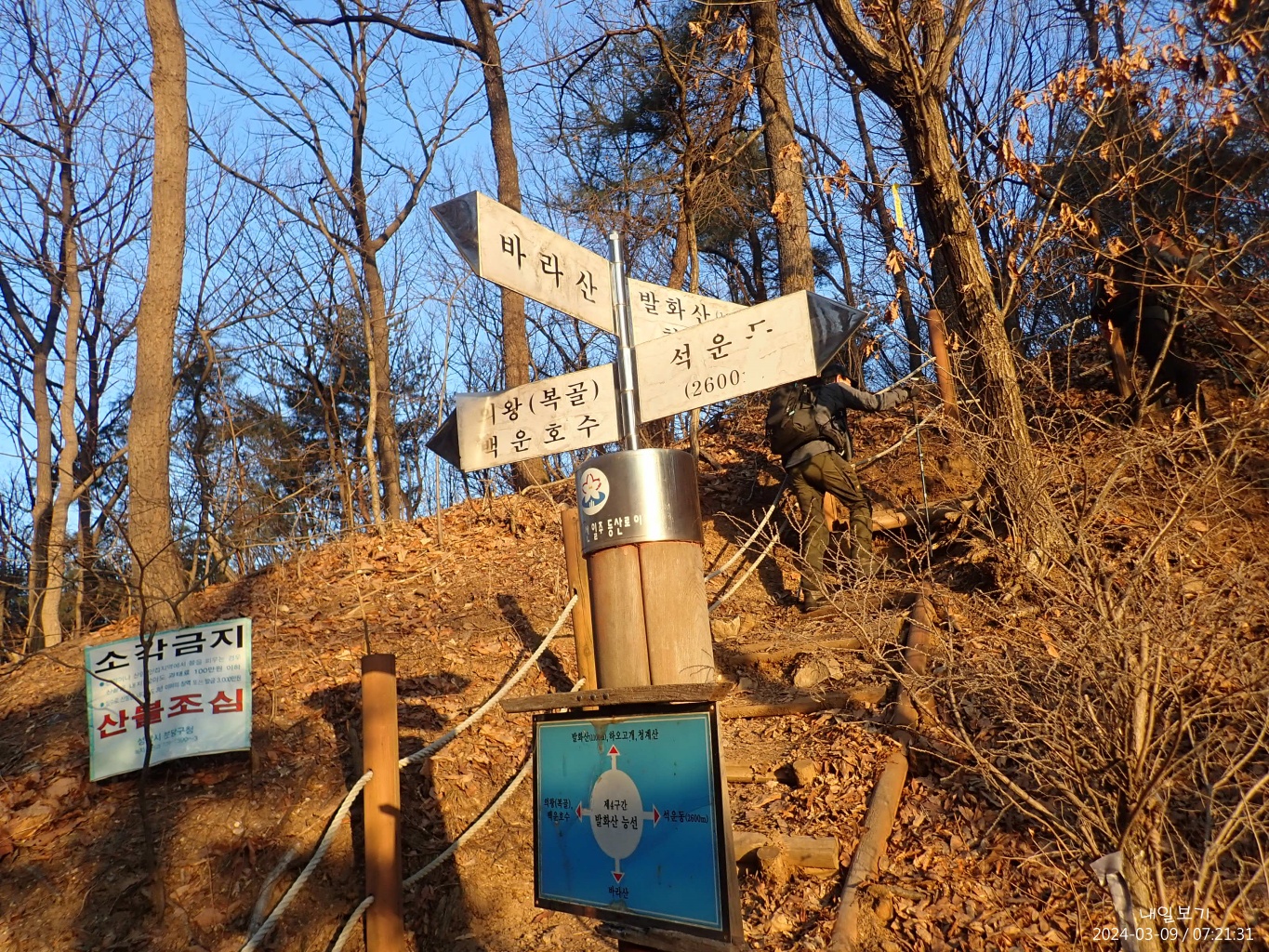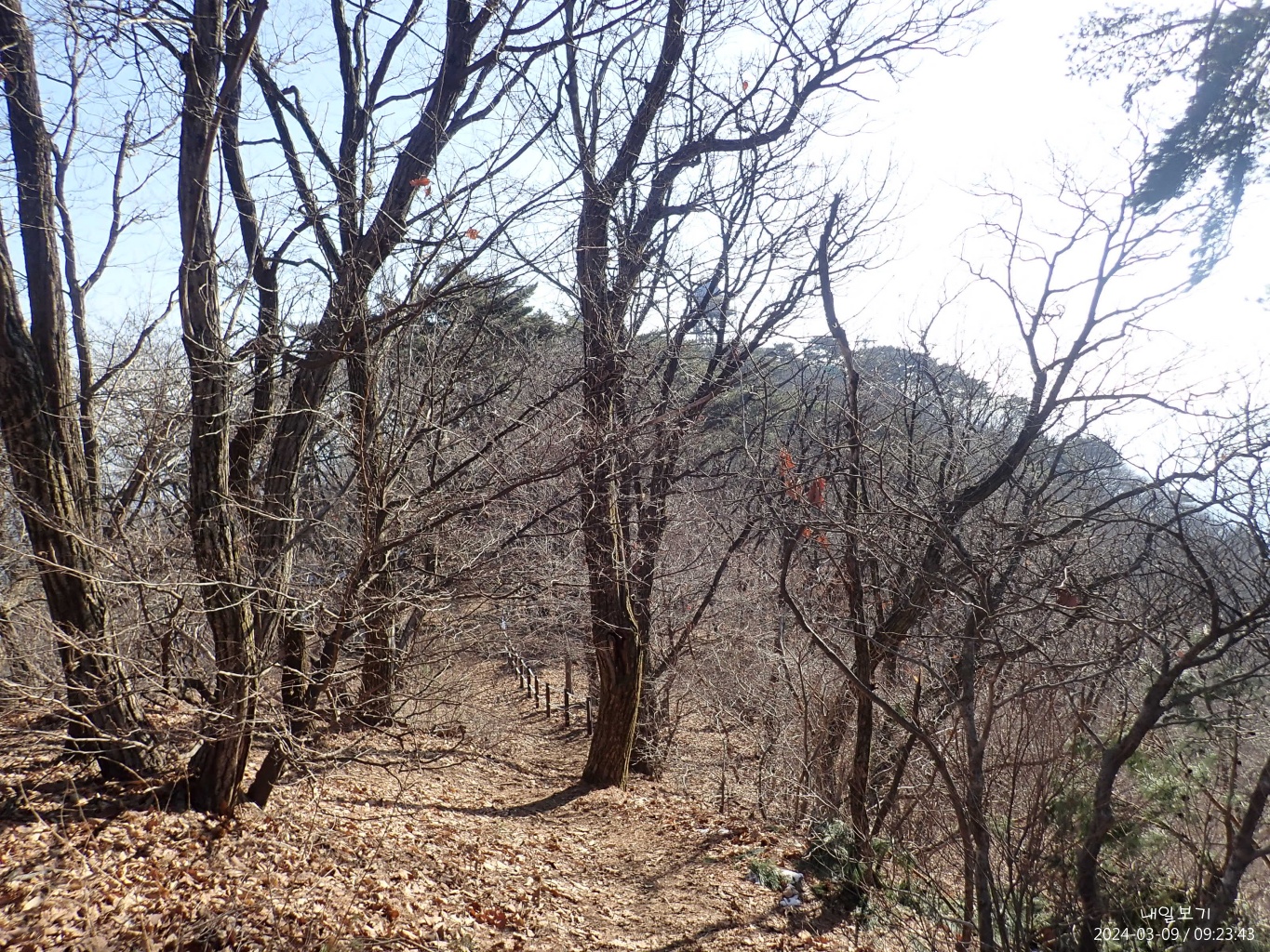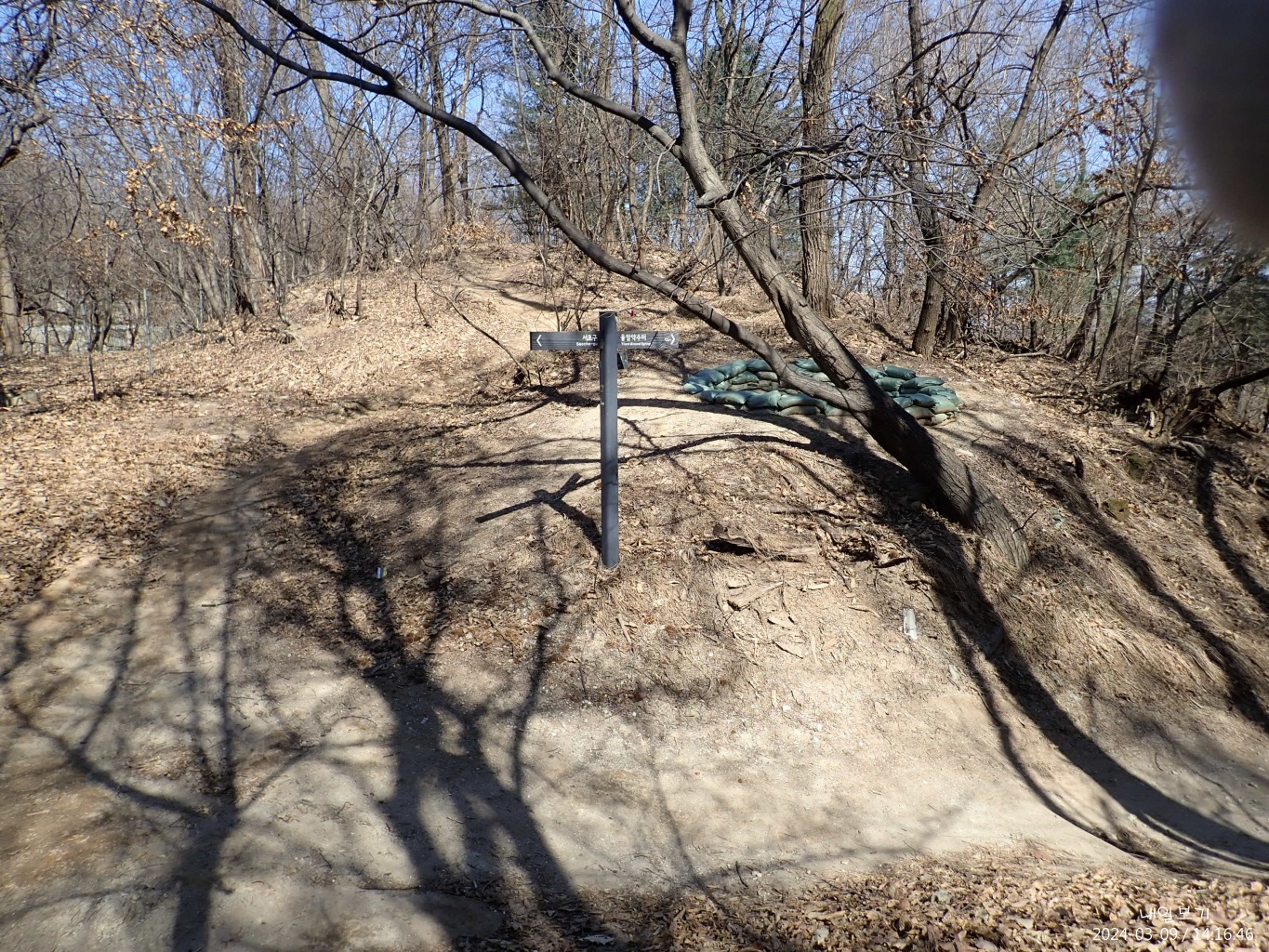 삼거리 이정목 이후 무심코 옛골낚시터-정토사쪽으로 내려가다 다시 능선으로 올랐다.