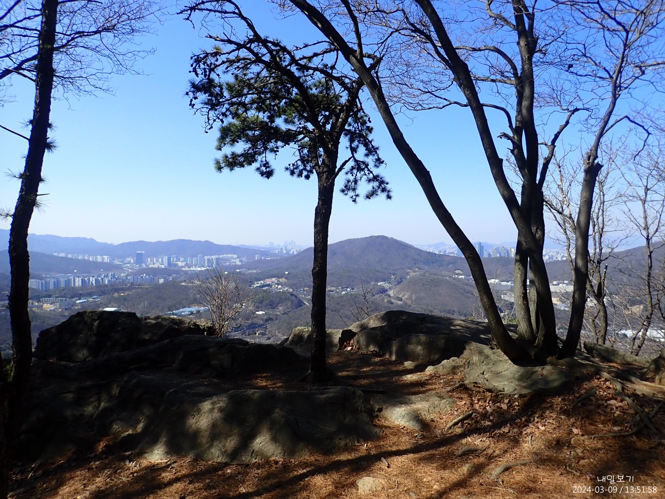 왼쪽 멀리 관악산-좌중간 우면산-구룡산-대모산(남쪽에 헌릉과 인릉이 있다)