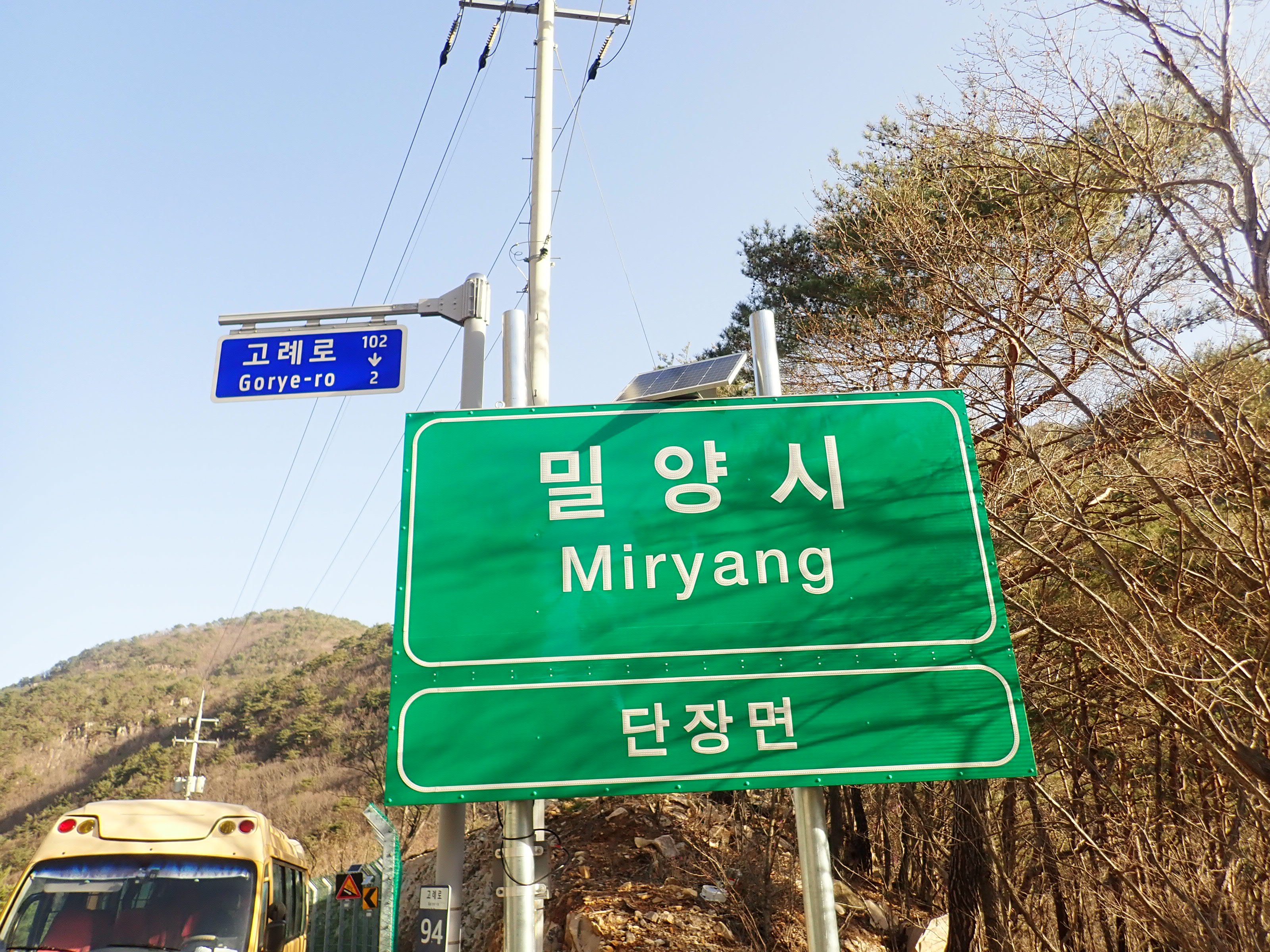 도로 한쪽은 단장천(밀양호 상류) 다른 쪽은 산사태 방지용 철망으로 막혀있다.