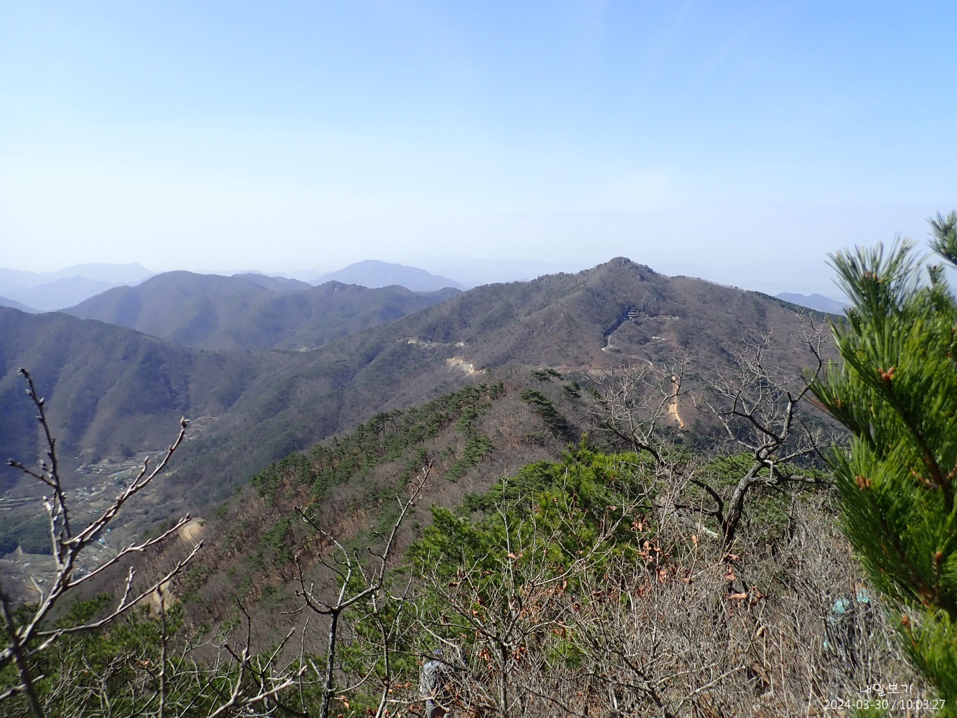 동쪽. 양산방향 영축지맥 산군과 아래 어영마을.