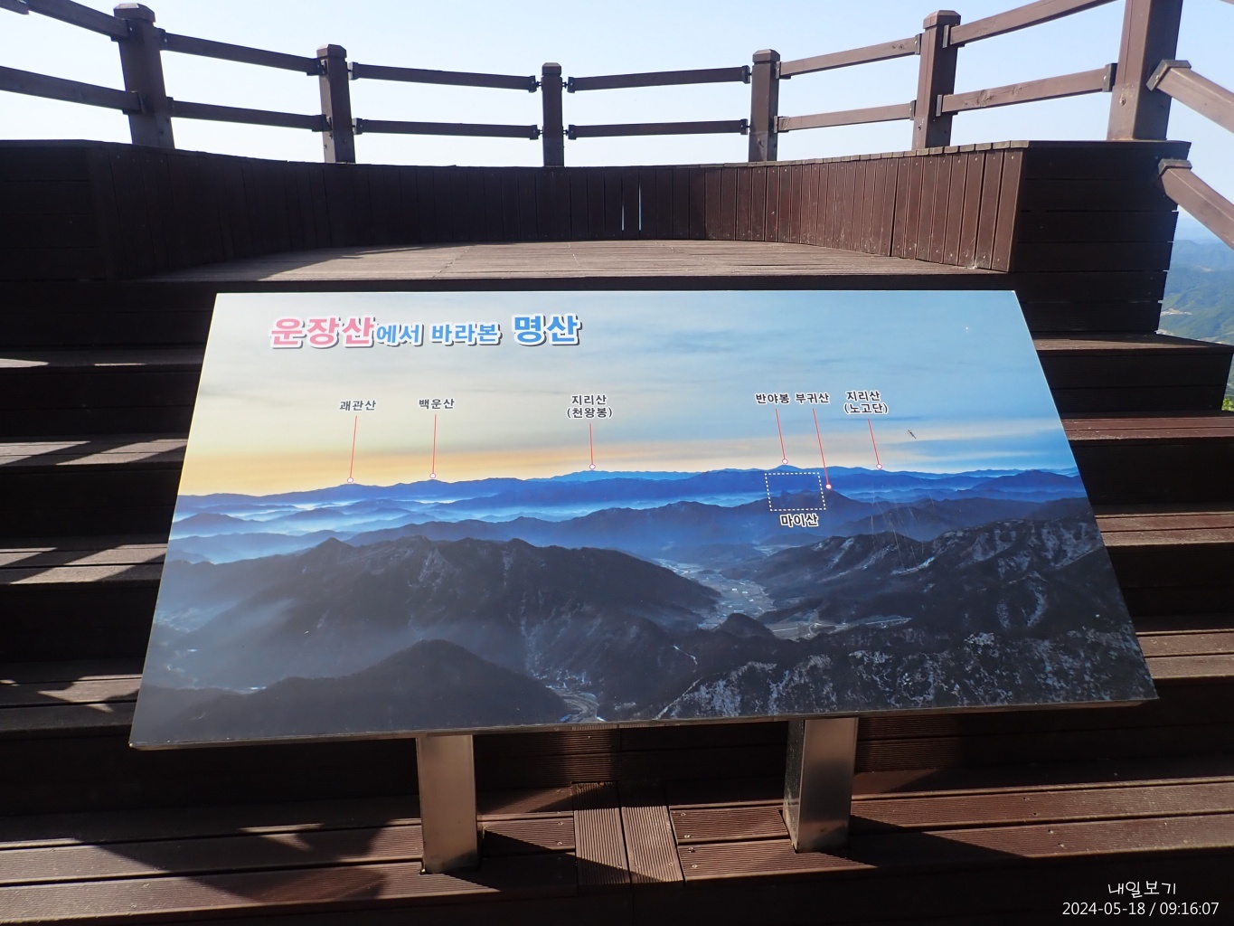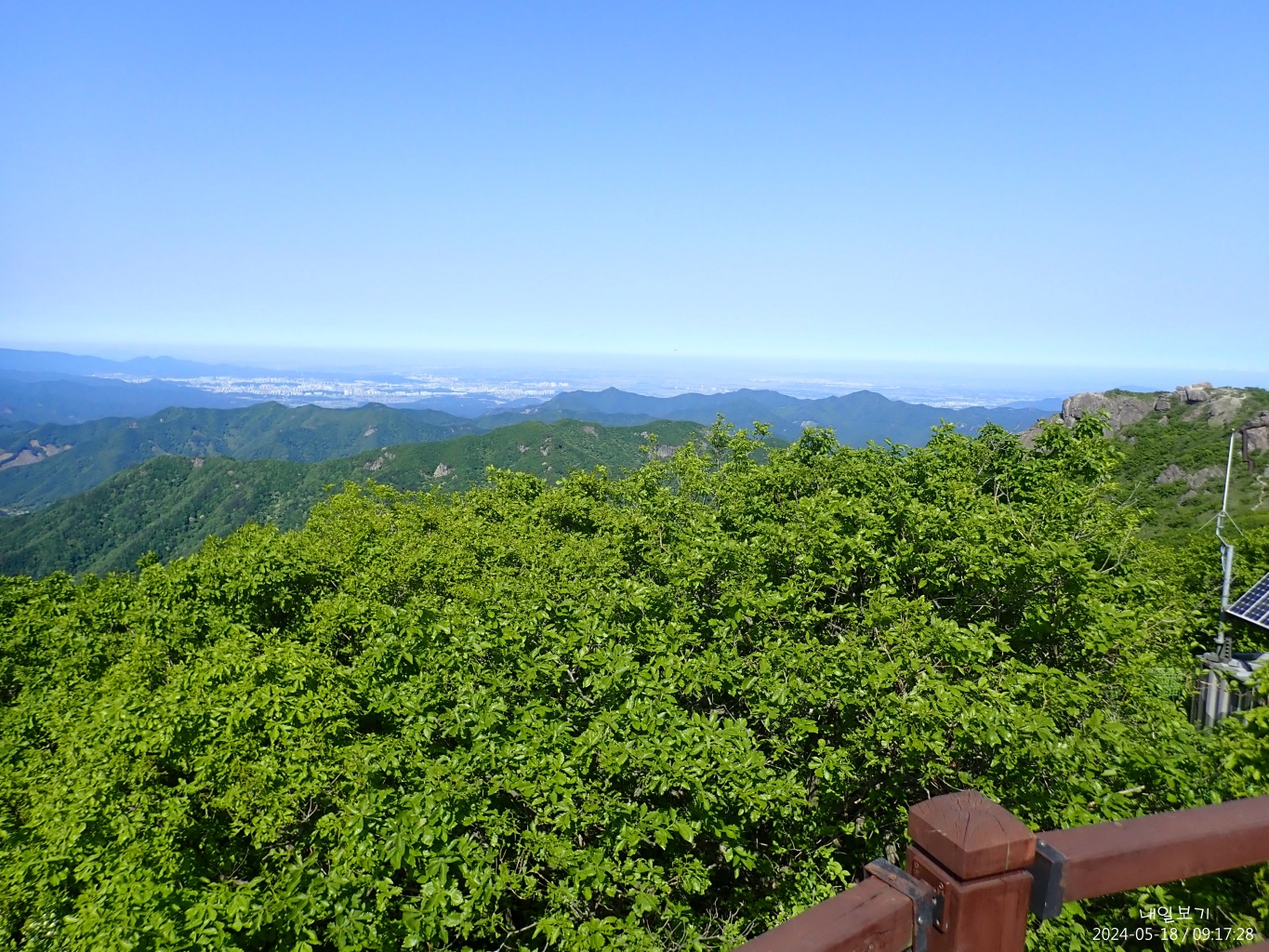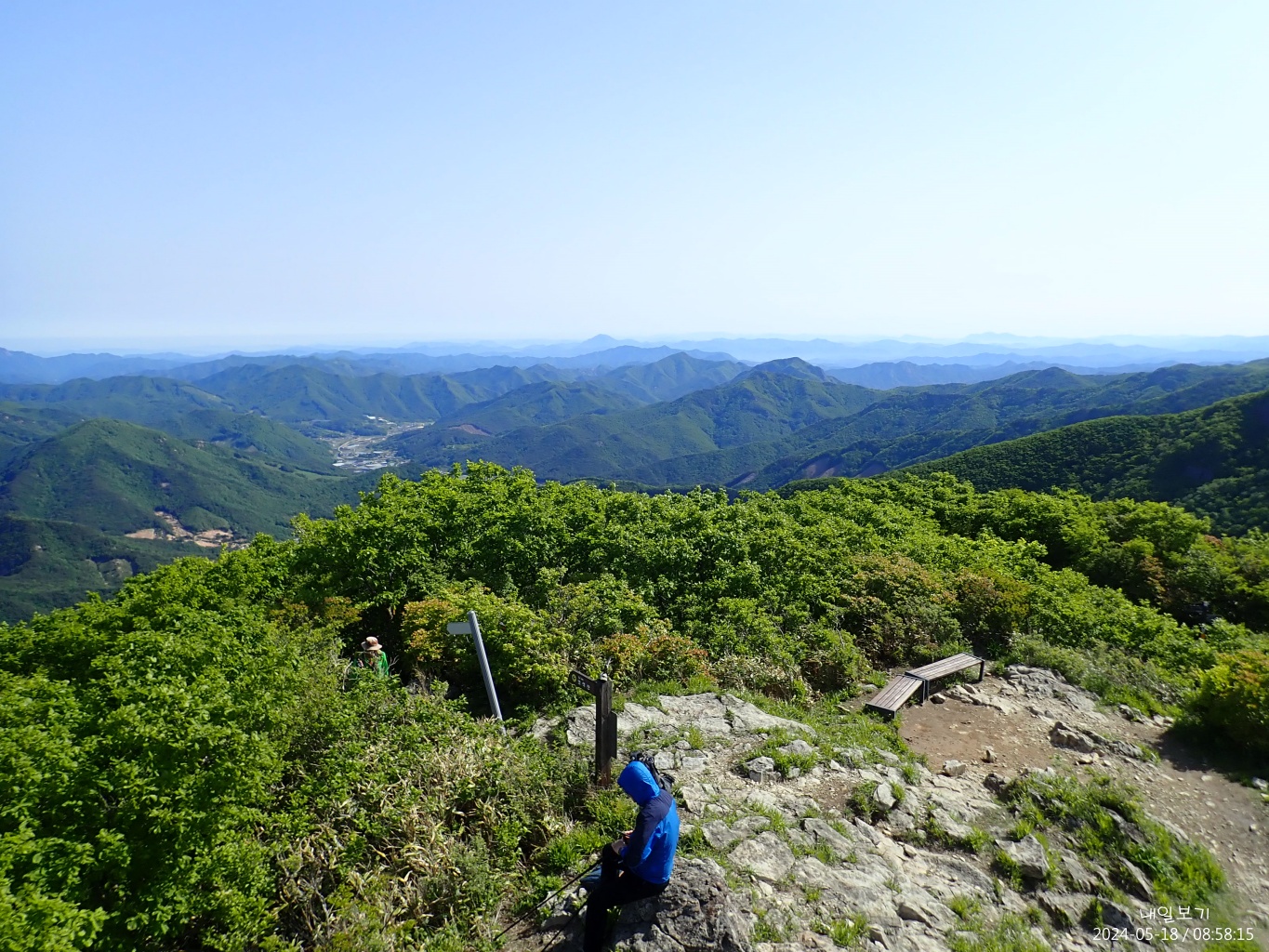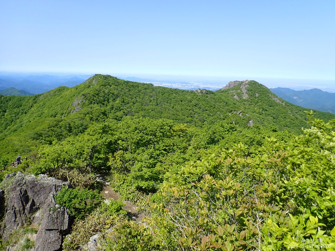 왼쪽 가까이 동봉(삼장봉)과 그 뒤 명덕봉으로 이어지는 능선 너머에 구봉산이 살짝보이고 오른쪽 멀리 덕유산.