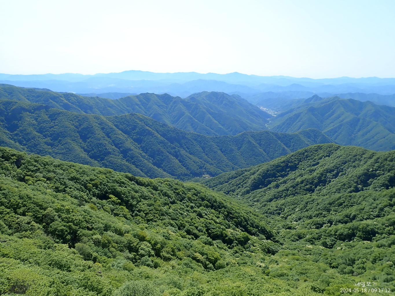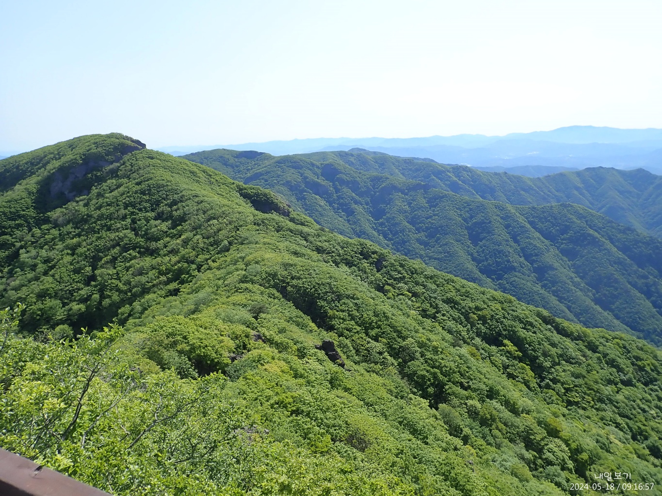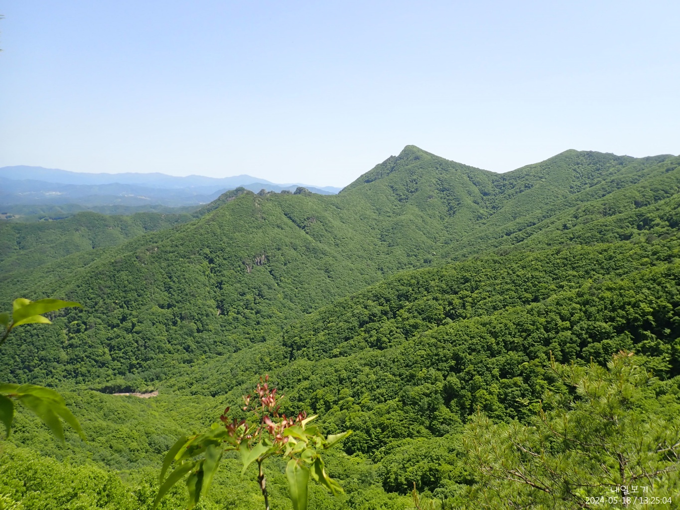 오른쪽 복두봉에서 내려서는 능선과 가운데 명도봉. 가운데 멀리 보이는 것이 서대산인듯 싶다.