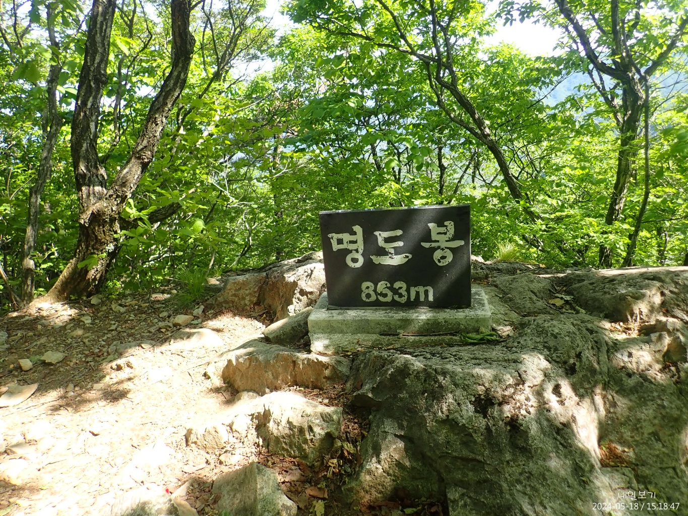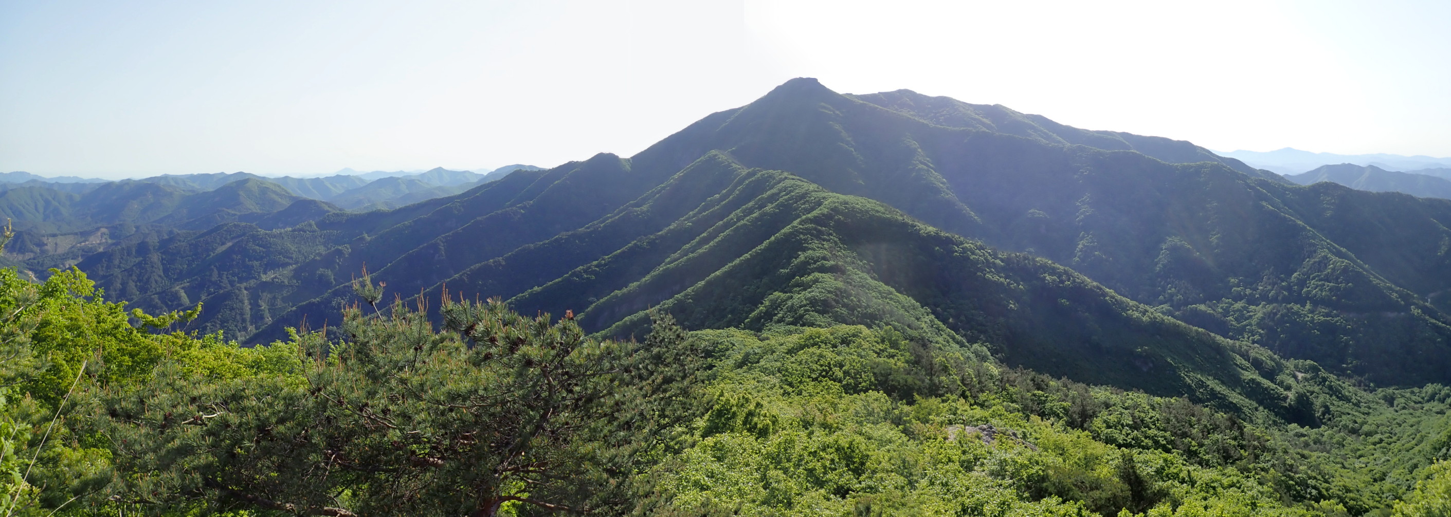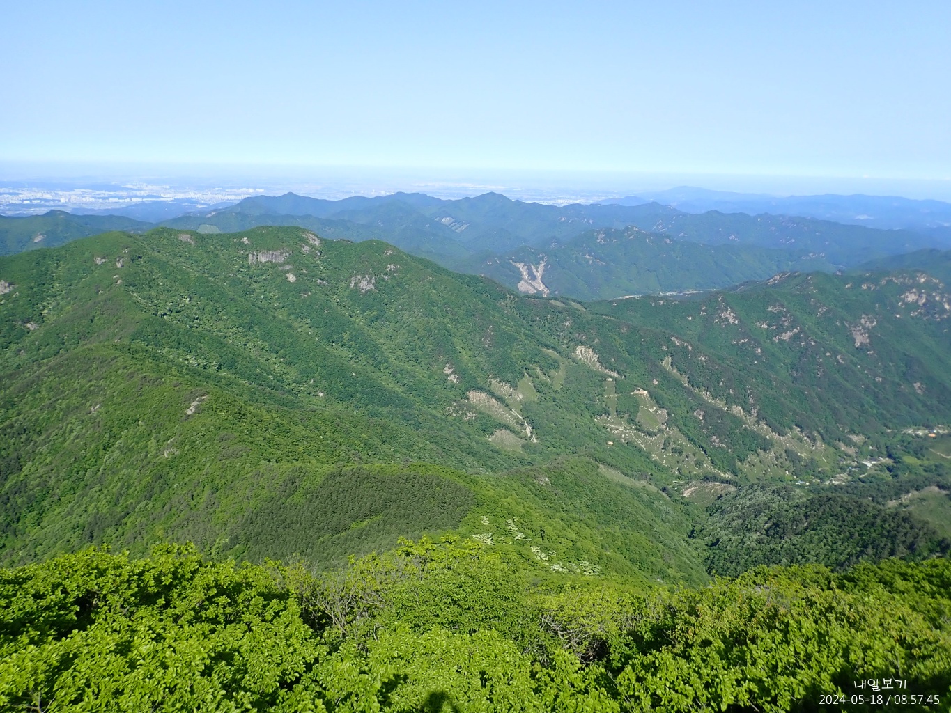 오른쪽 복두봉에서 내려서는 능선과 가운데 명도봉. 가운데 멀리 보이는 것이 서대산인듯 싶다.