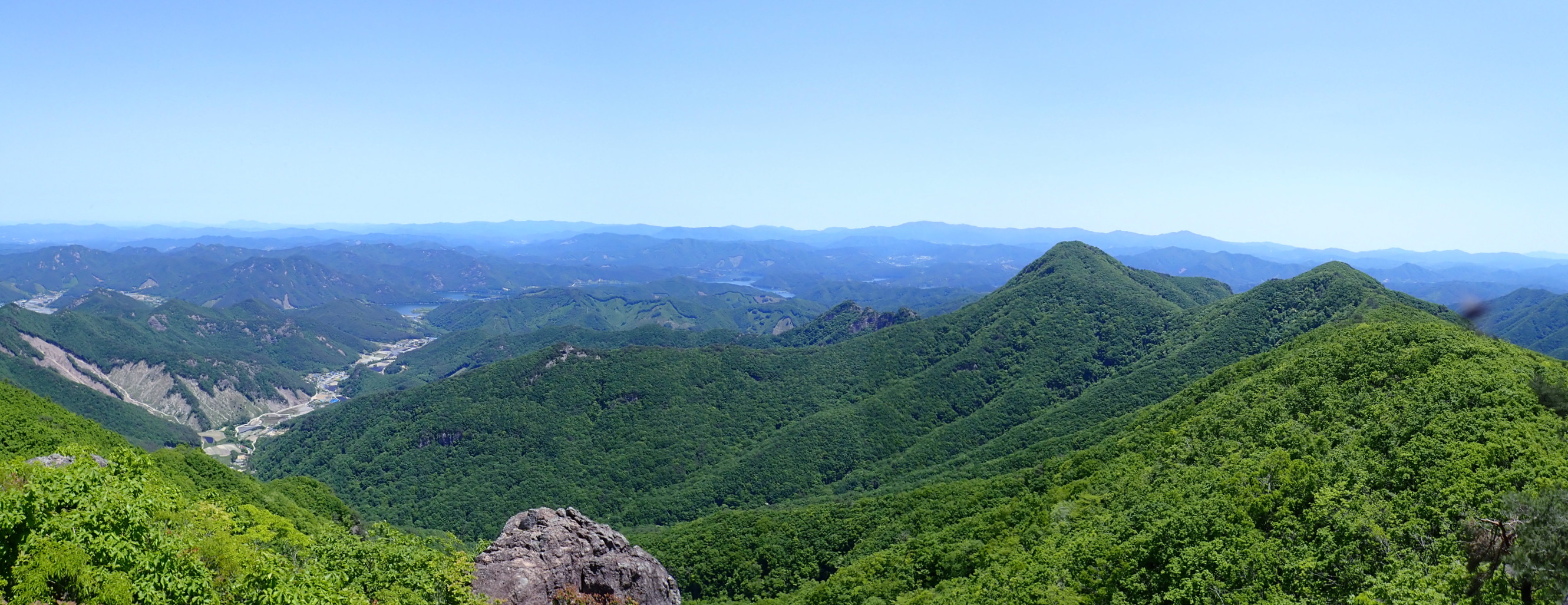 가운데 명덕봉과 뒤에 보이지 않지만 용담댐이 있을테고, 멀리 덕유산 능선.