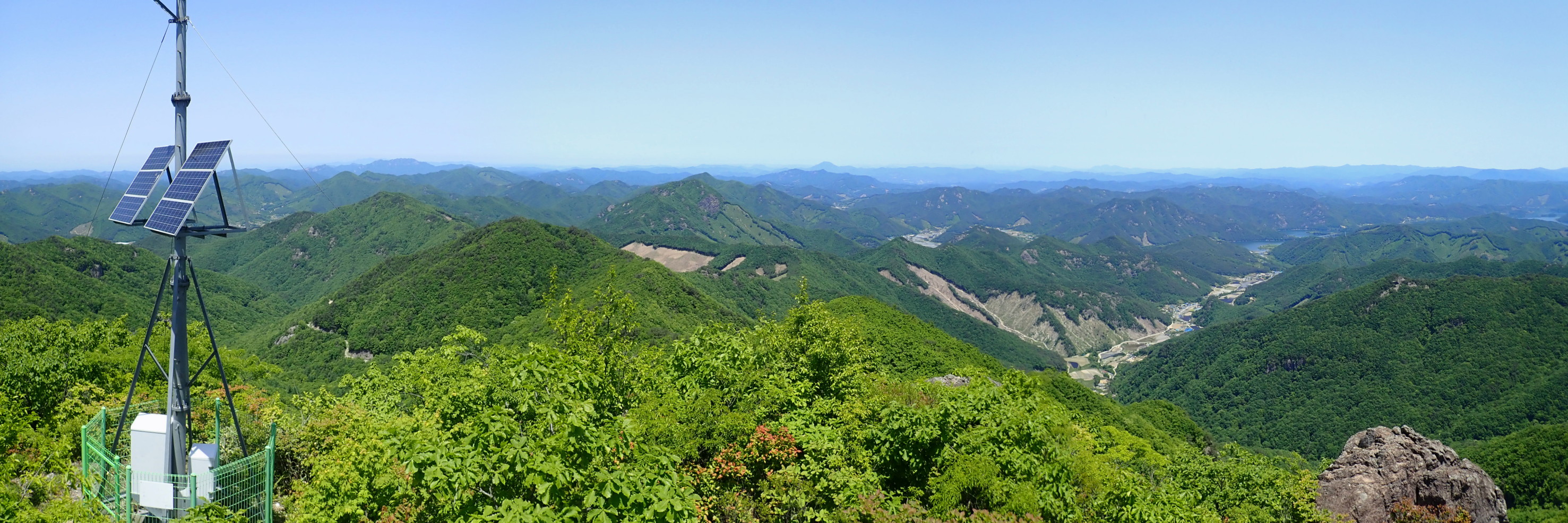 가운데 충남과 전북의 경계 봉화산과 용담댐. 우중간 멀리 덕유산.