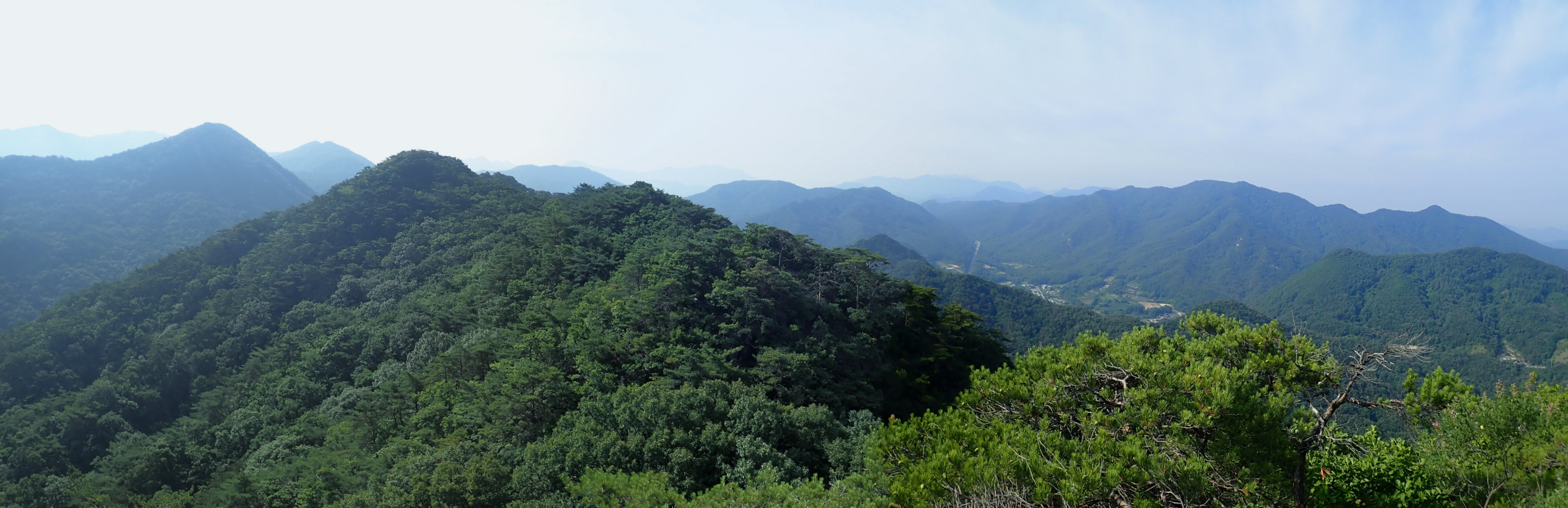 북동쪽. 왼쪽 비학산과 군자산 우중간 희미한 남군자산과 오른쪽 옥녀봉.