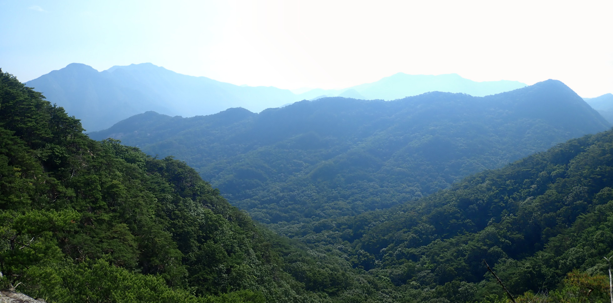 남동쪽. 오른쪽 옥녀봉 우중간 괴산 사랑산