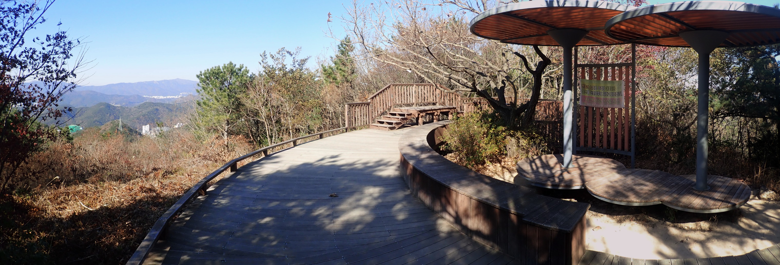 전망데크에서 서쪽. 멀리 왼쪽 백양산 오른쪽 금정산 능선. 동래구 도심.