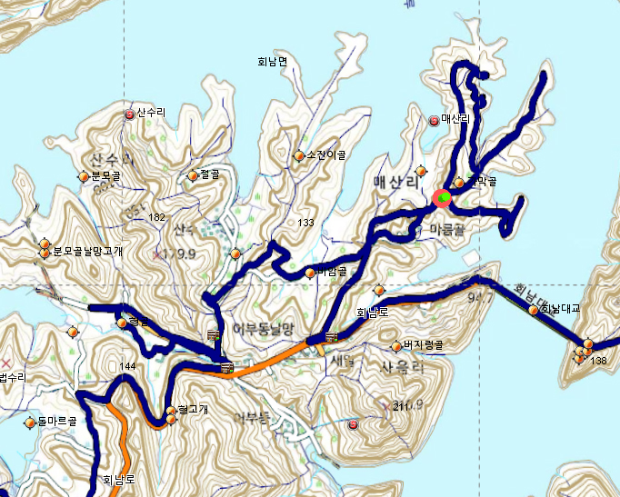 매산리 가막골쪽과 법수리 연꽃마을쪽과 북수골쪽 오동쪽등 대청호 수위가 높아 길이 잠긴부분이 있었고, 카카오맵에 표시된 부분이 변경된 루트를 반영하지 못한점과 안내표시가 부족했던점등이 아쉬웠다. 지금 확인하니 네이버지도는 또 다르게 표시돼있네?