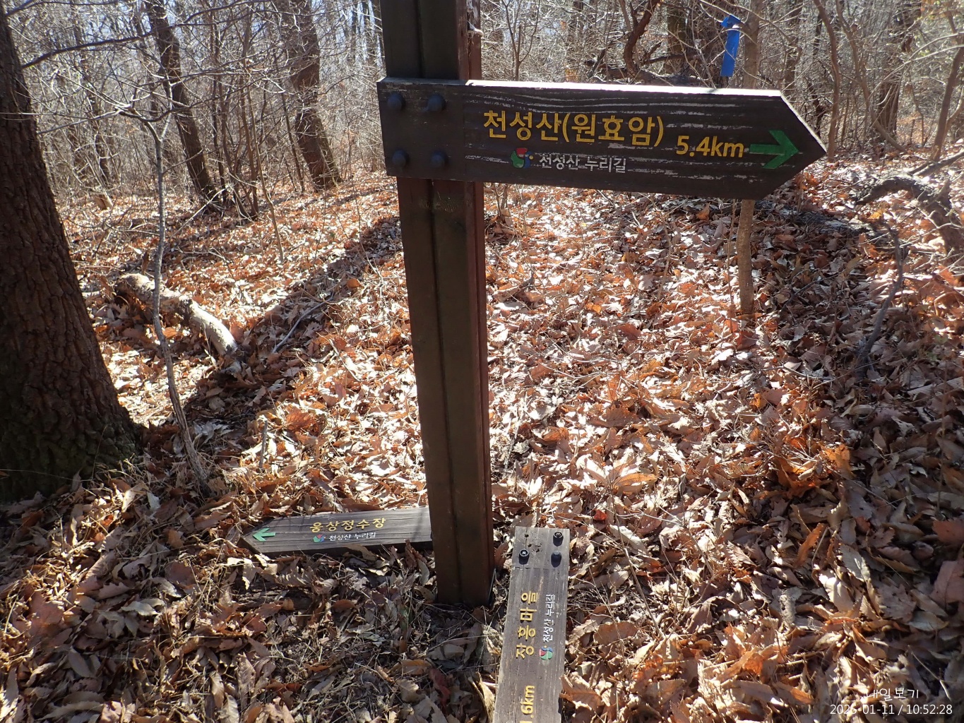 새로 설치된 이정목. 2017년엔 아래 사진. 능선따라 명곡마을과 신기산성으로 내려갈 수 있다.
