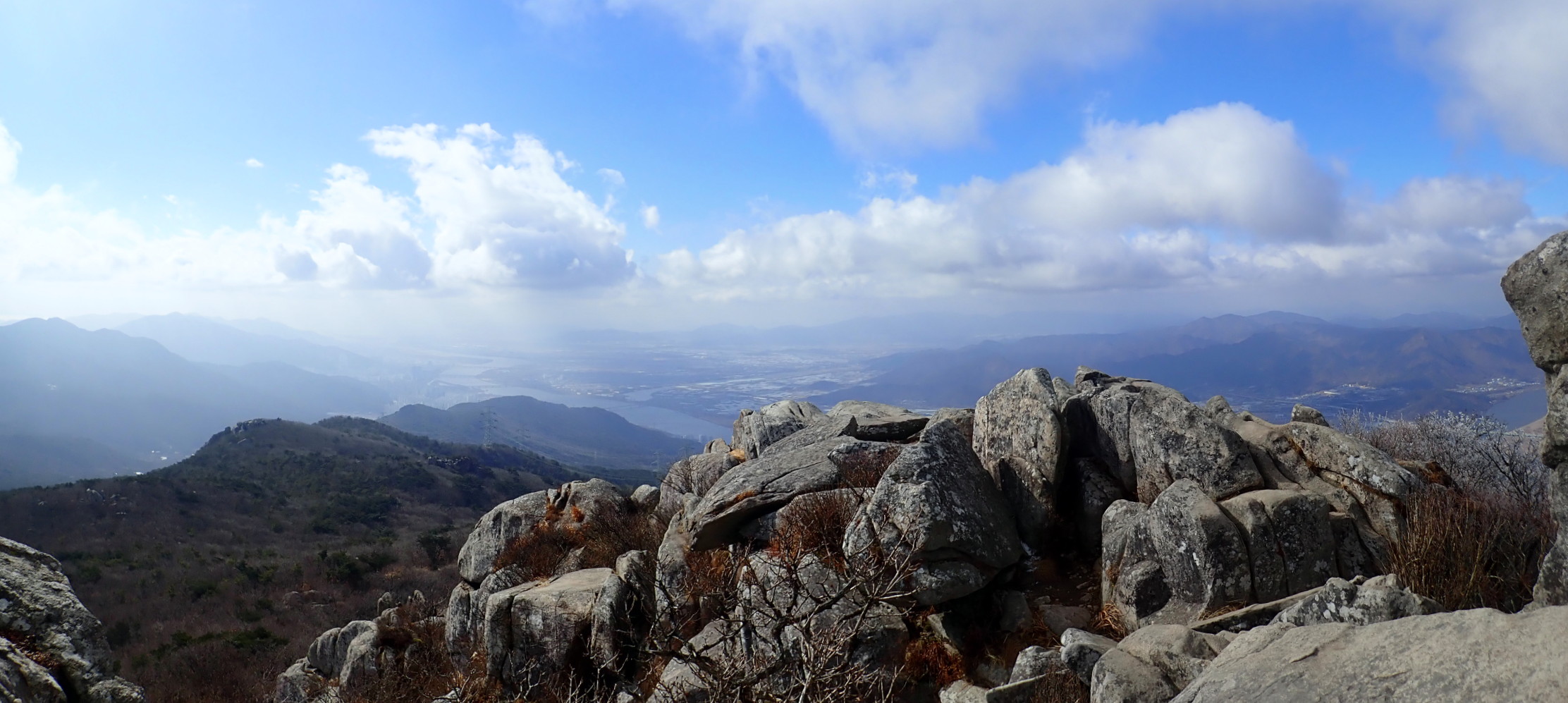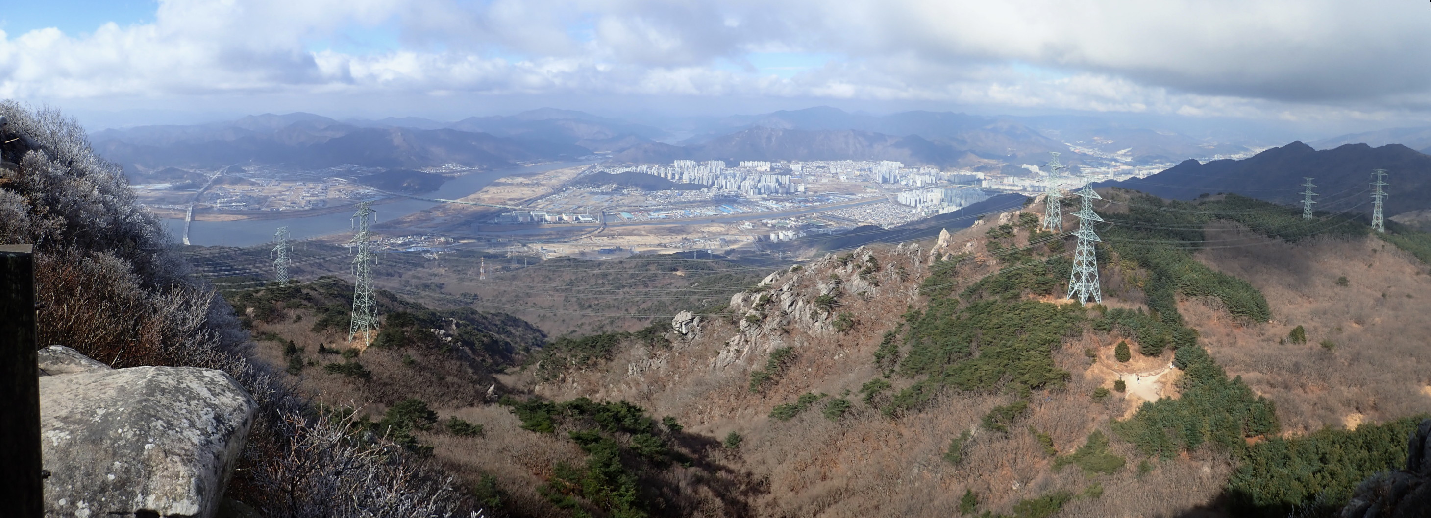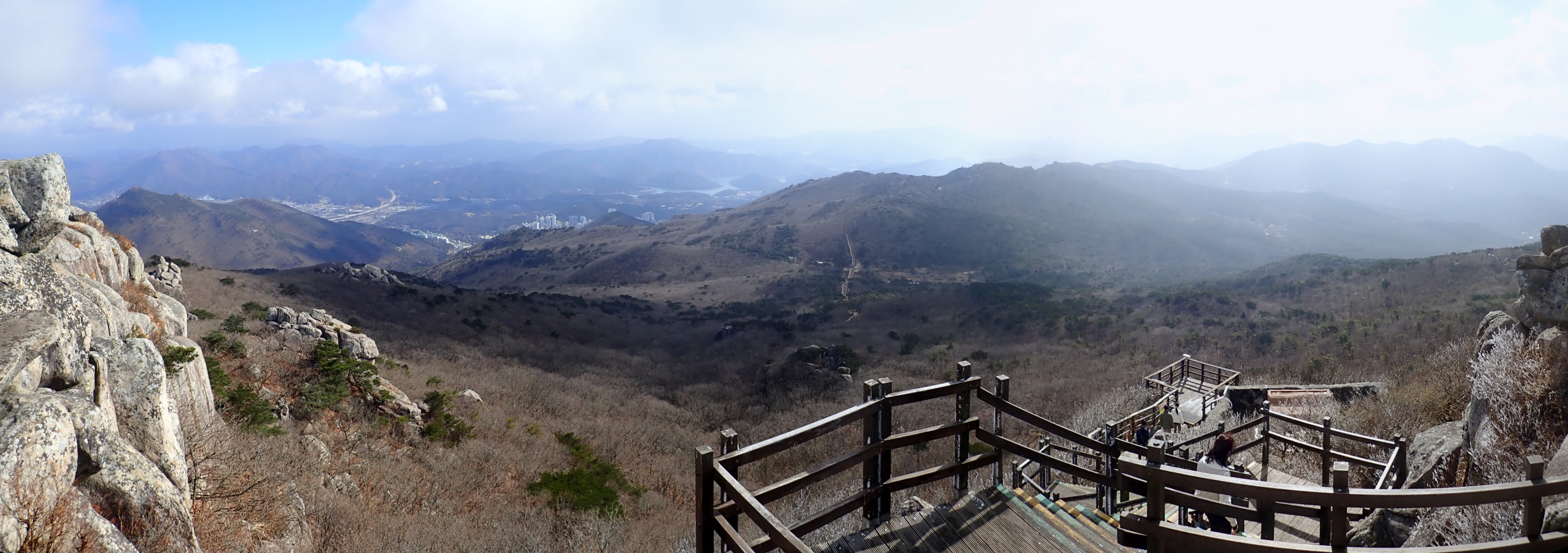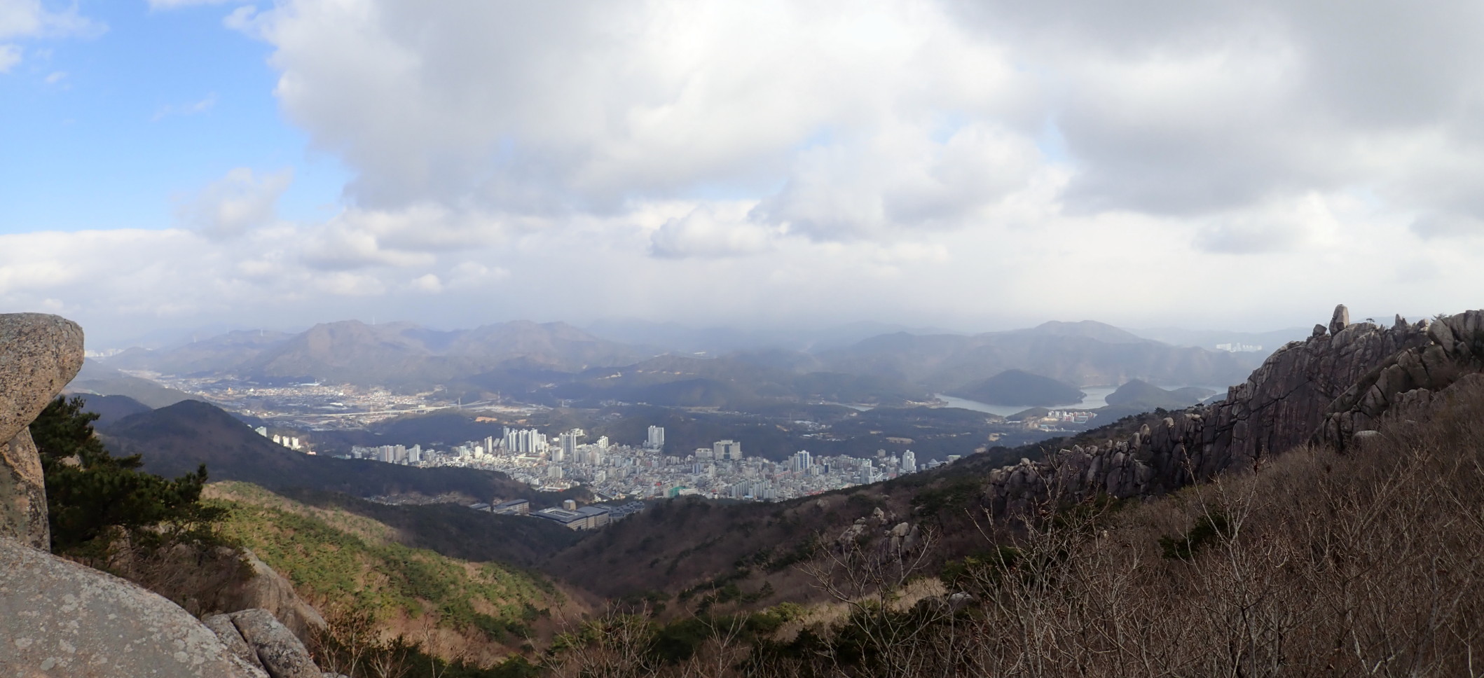 남쪽. 의상봉과 오른쪽 아래 산성고개. 좌중간 멀리 해운대 장산. 우중간 희미한게 태종대 봉래산인가?
