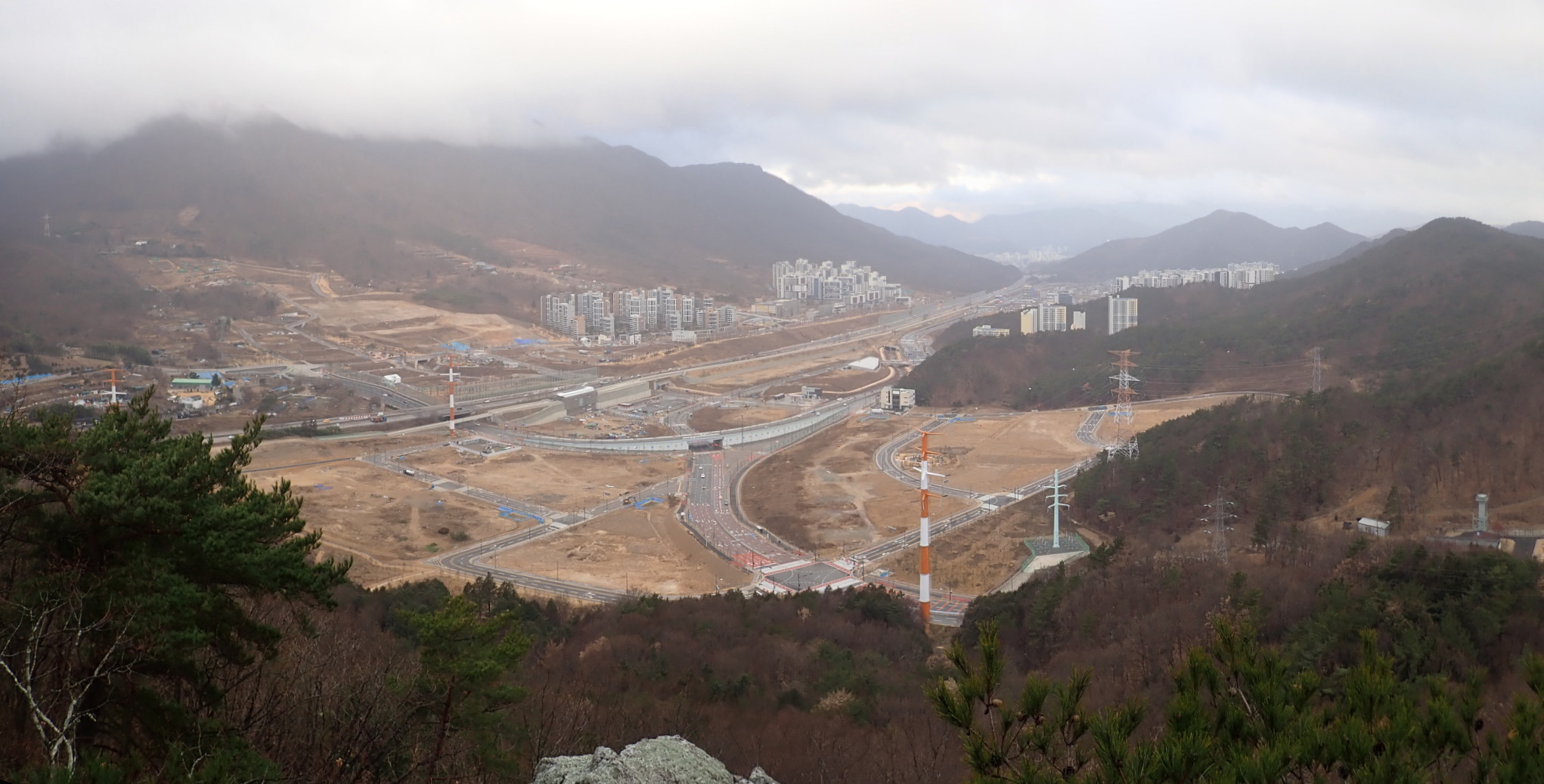 사배이산 지나 조망바위에서 서쪽. 경부고속도로가 지나는 사송리일원. 사진 왼쪽(남서쪽)으로 내려가면 지경고개가 있다.