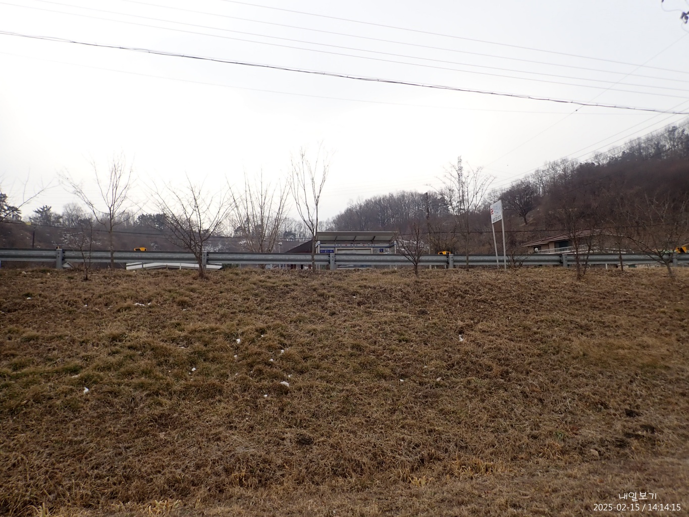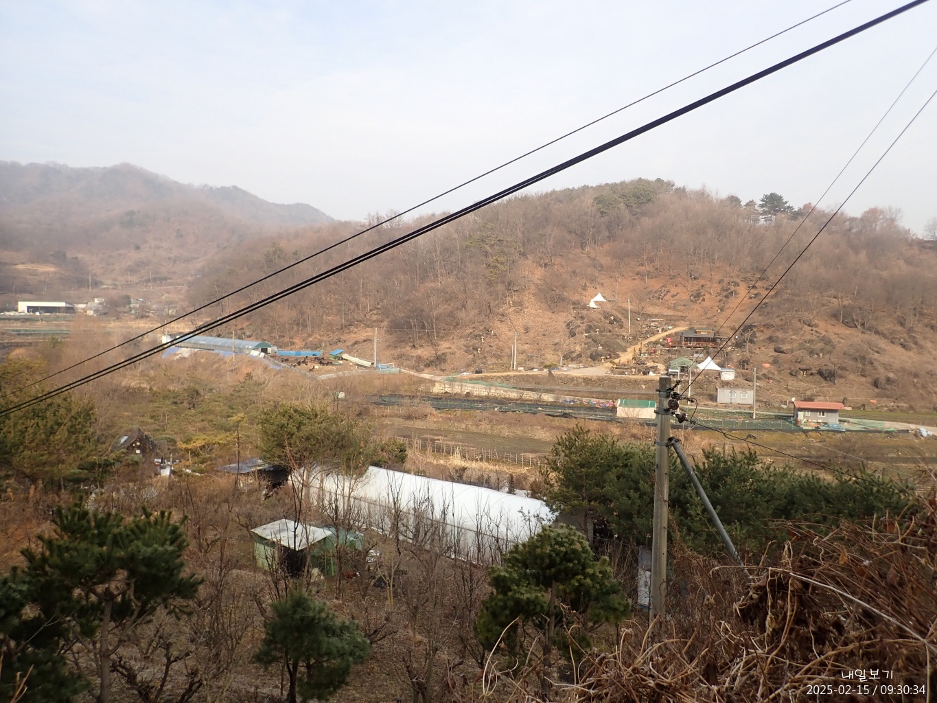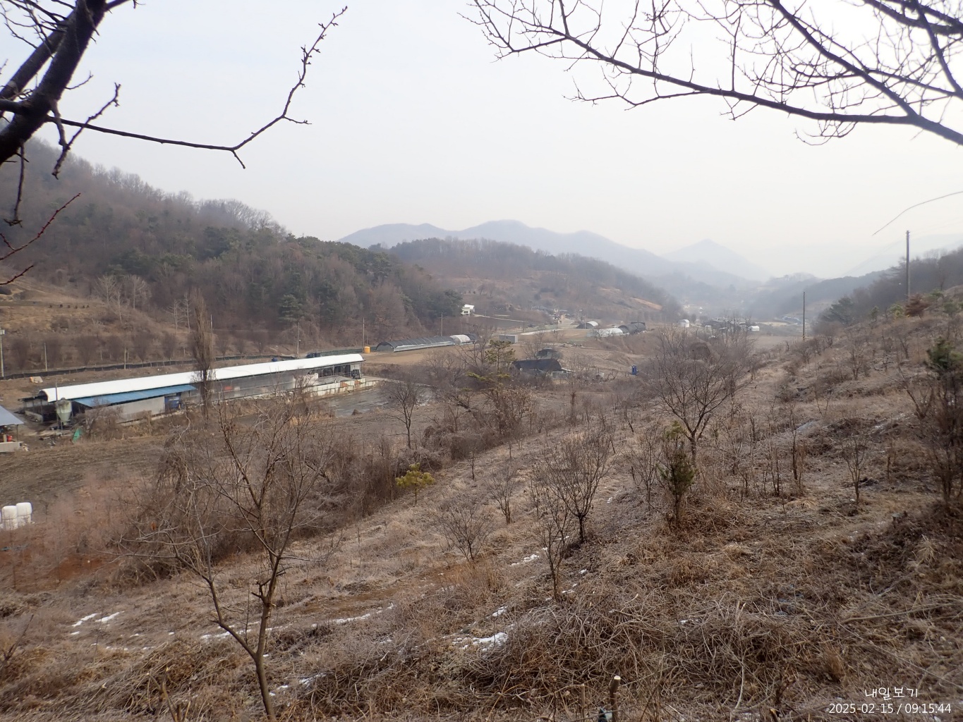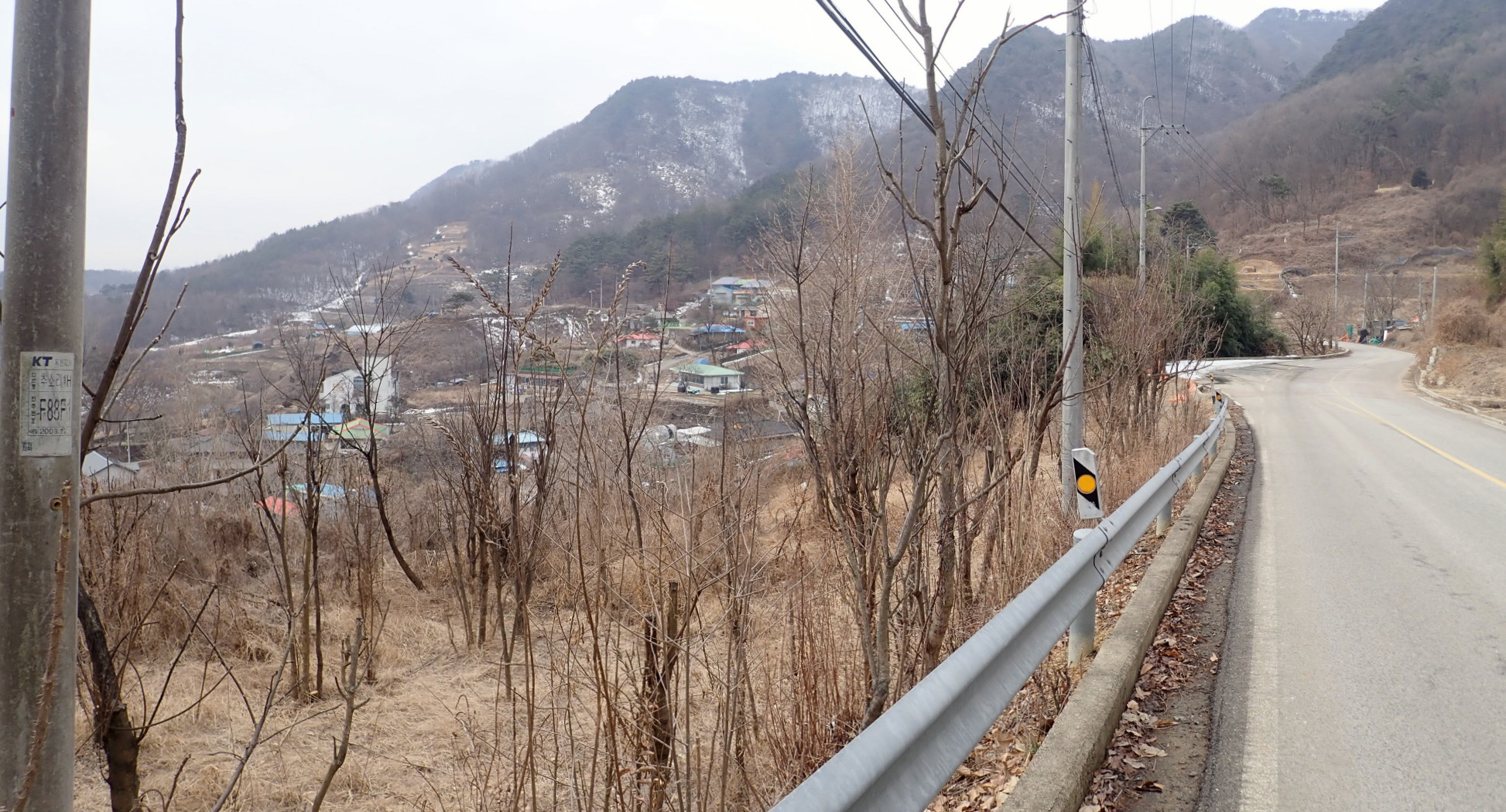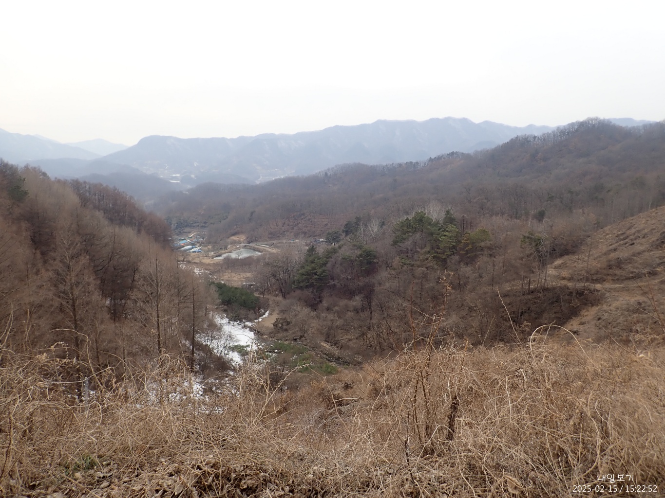 절개지 왼쪽 작은 봉우리에 올라 북서쪽. 우중간 꽃봉과 방아실. 좌중간 대정분교인근.