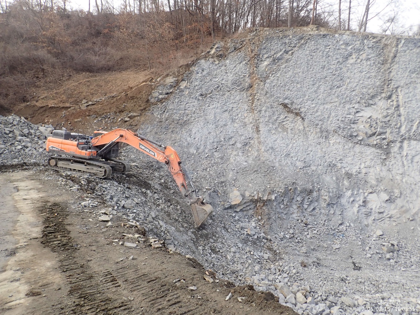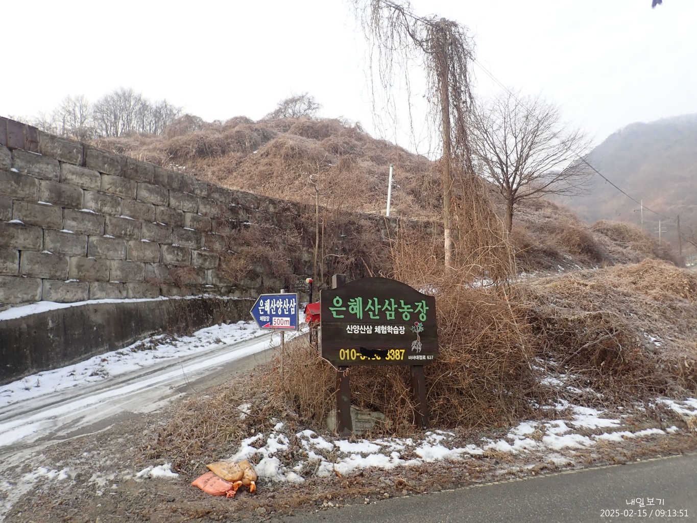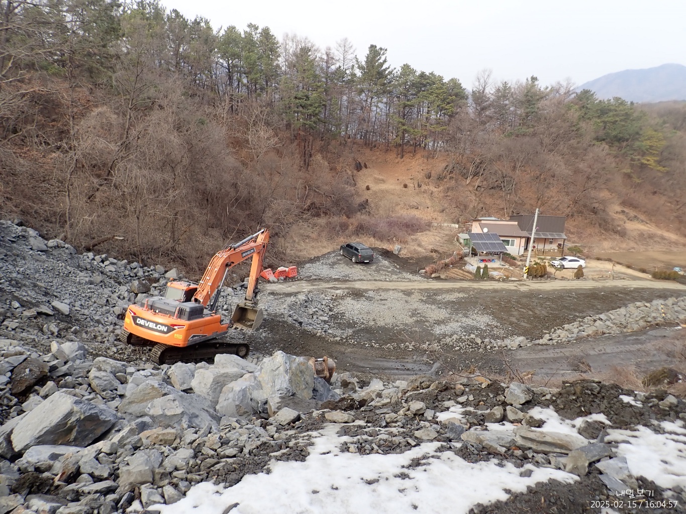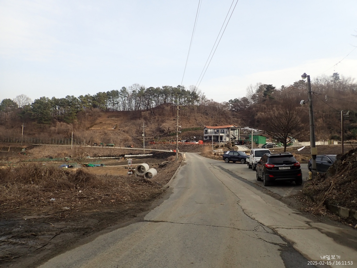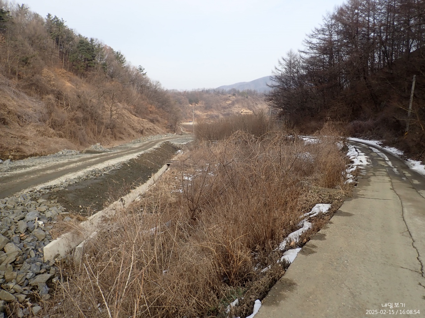 절개지 왼쪽 작은 봉우리에 올라 북서쪽. 우중간 꽃봉과 방아실. 좌중간 대정분교인근.