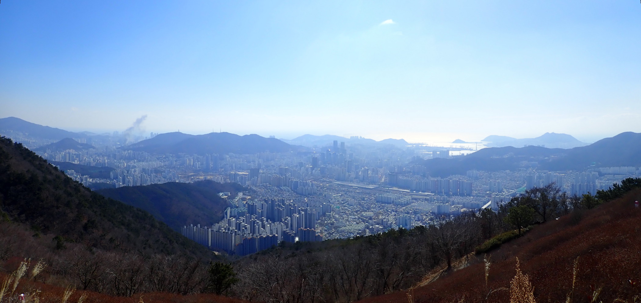 금련산 왼쪽에 연기가 좀 허얘졌다. 오른쪽 멀리 부산항과 영도 봉래산.