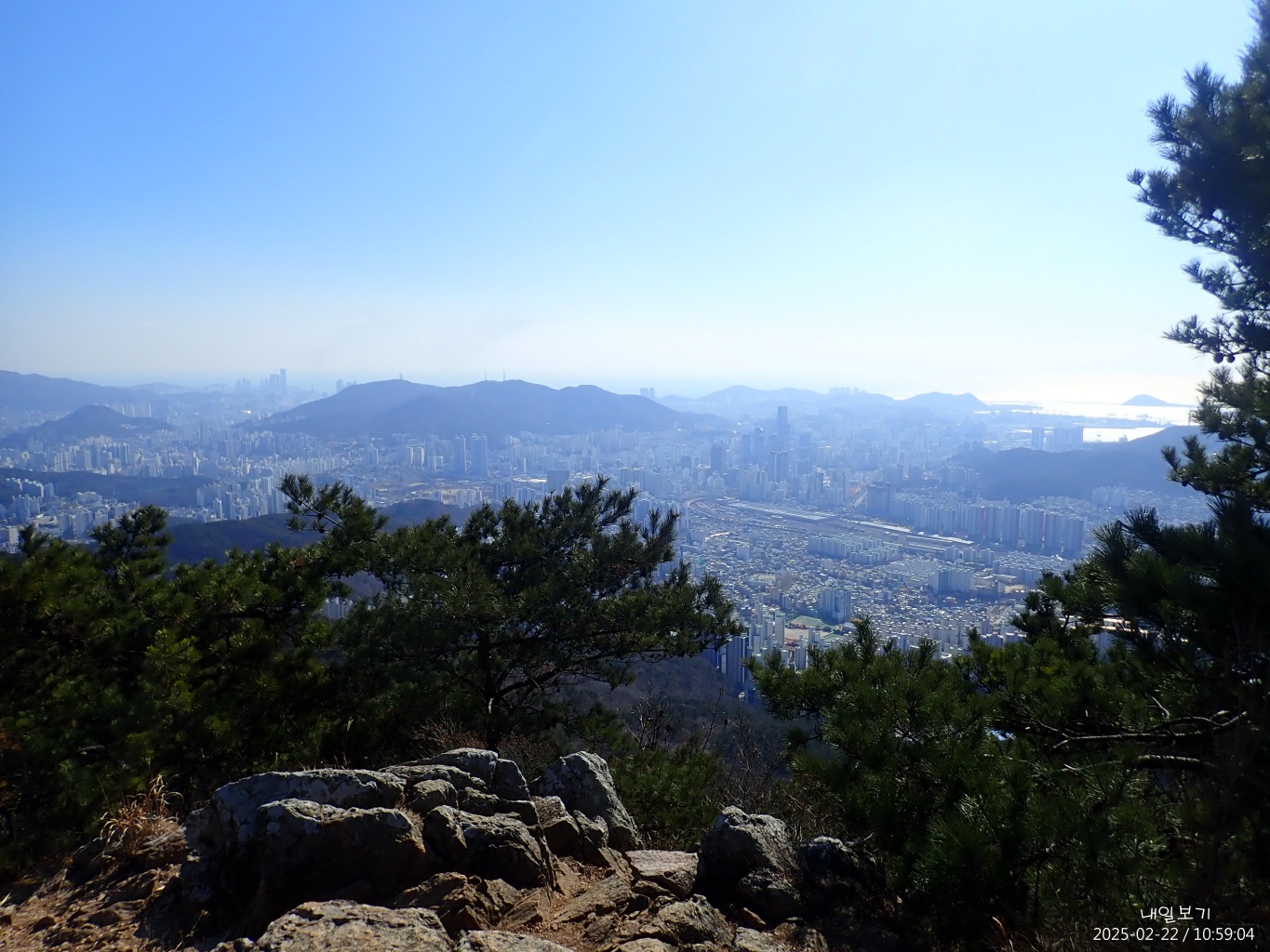 돌 무더기앞에서 북쪽. 아래 경부선철도와 백양대로가 지나는 부산진구 개금고개와 건너편 백양산.