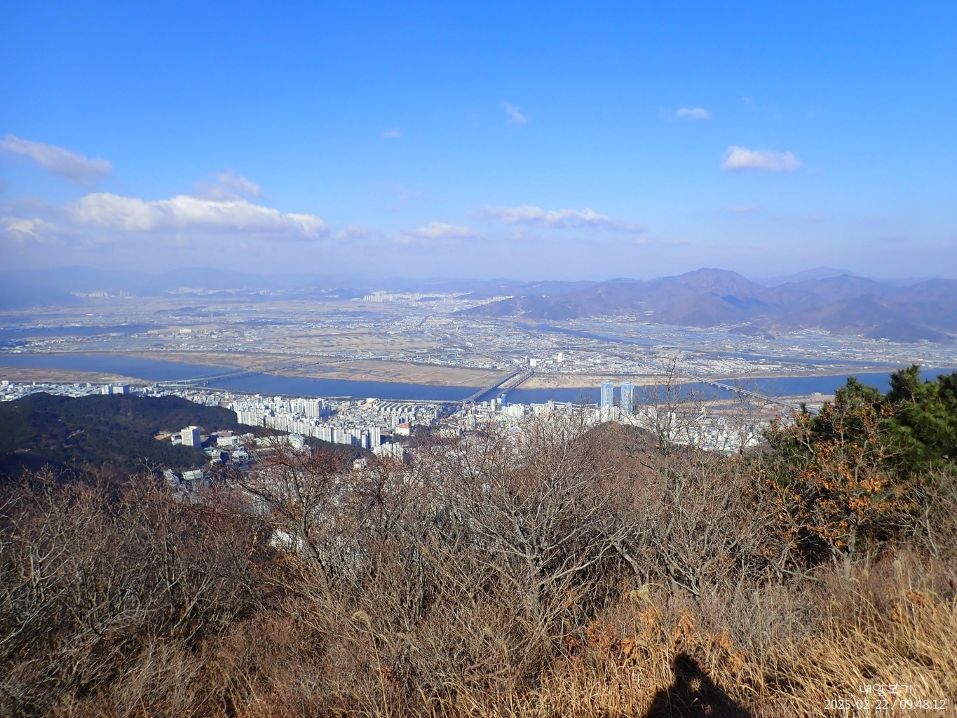왼쪽 멀리 구덕산과 승학산 좌중간 가까이 유두봉과 낙동강 하구 을숙도와 김해국제공항.