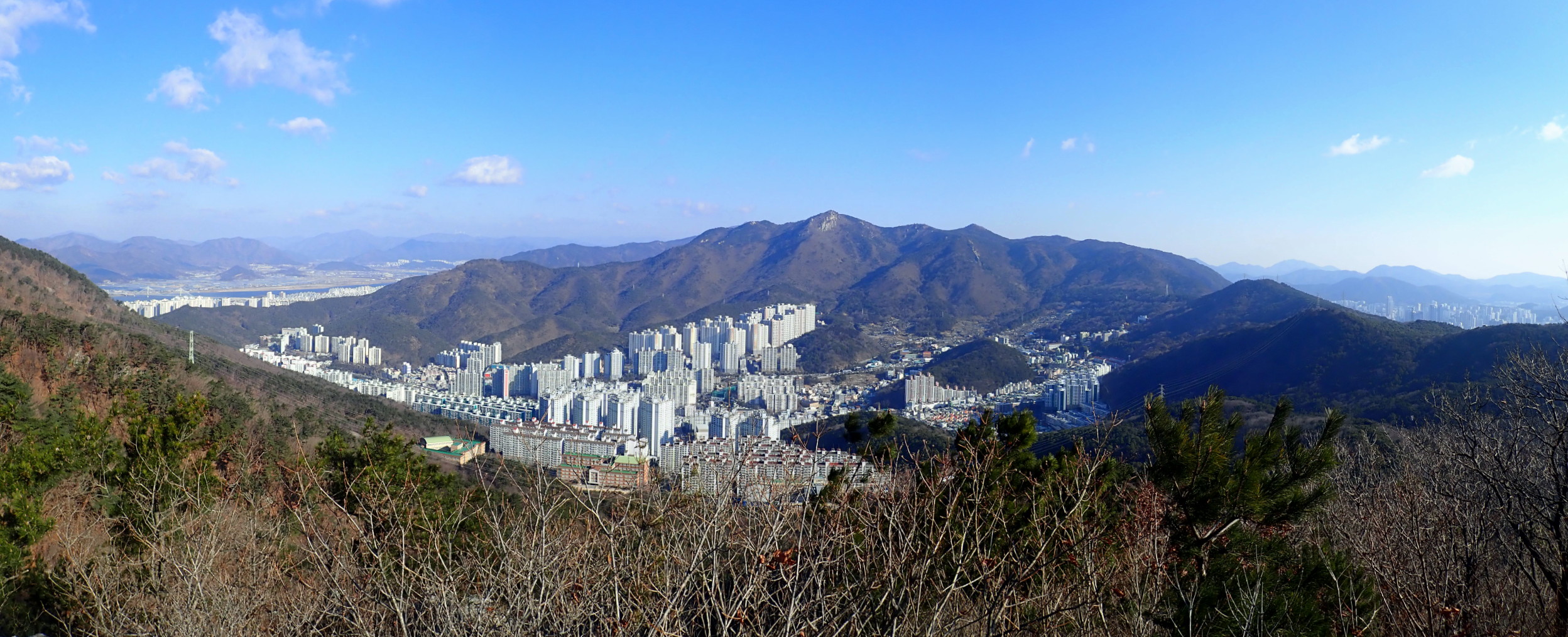 북동쪽. 가운데 금정봉(쇠미산)과 우중간 멀리 장산. 우중간 부산종합운동장.