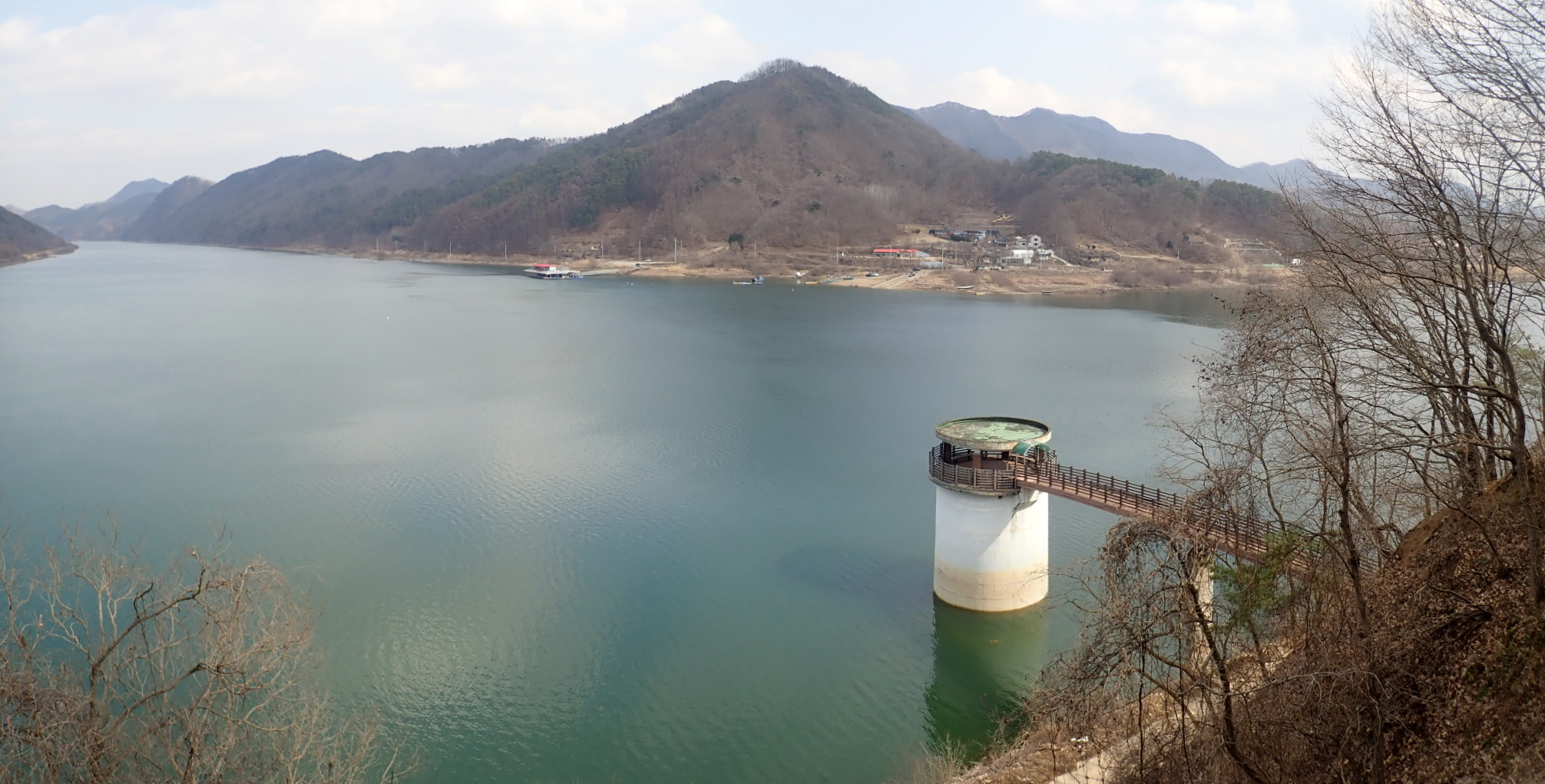 건너편 석탄리 안터마을과 옥봉산 뒤로 탑산. 아래는 수변전망대(예전에 취수탑).