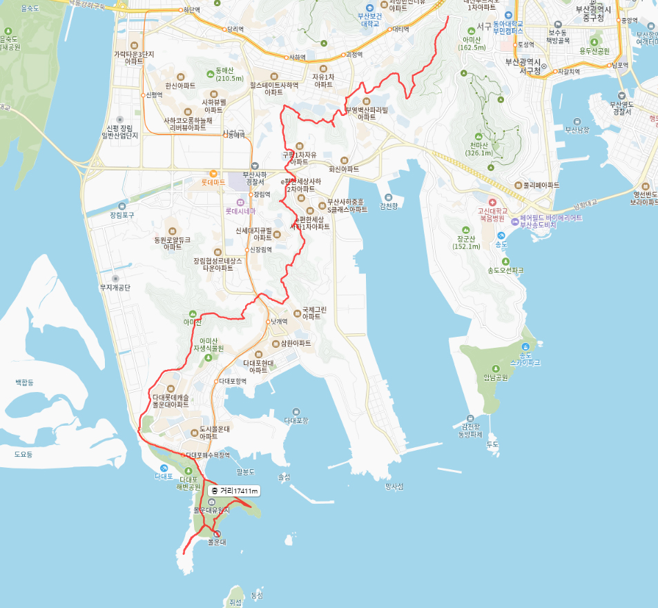 홍티에서 롯데캐슬몰운대아파트 오른쪽 도로따라 내려섰다.