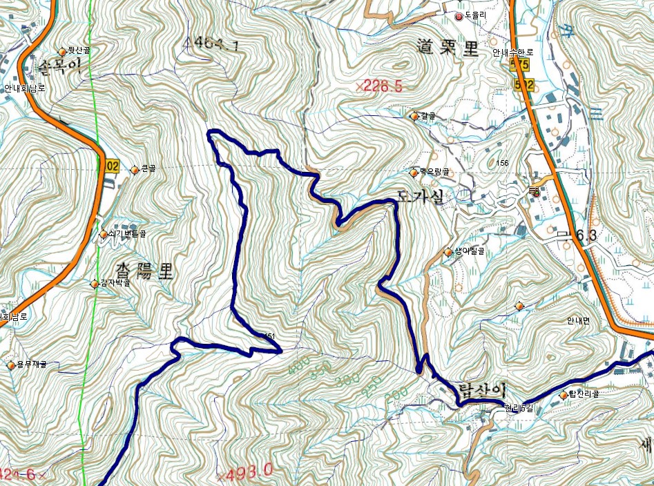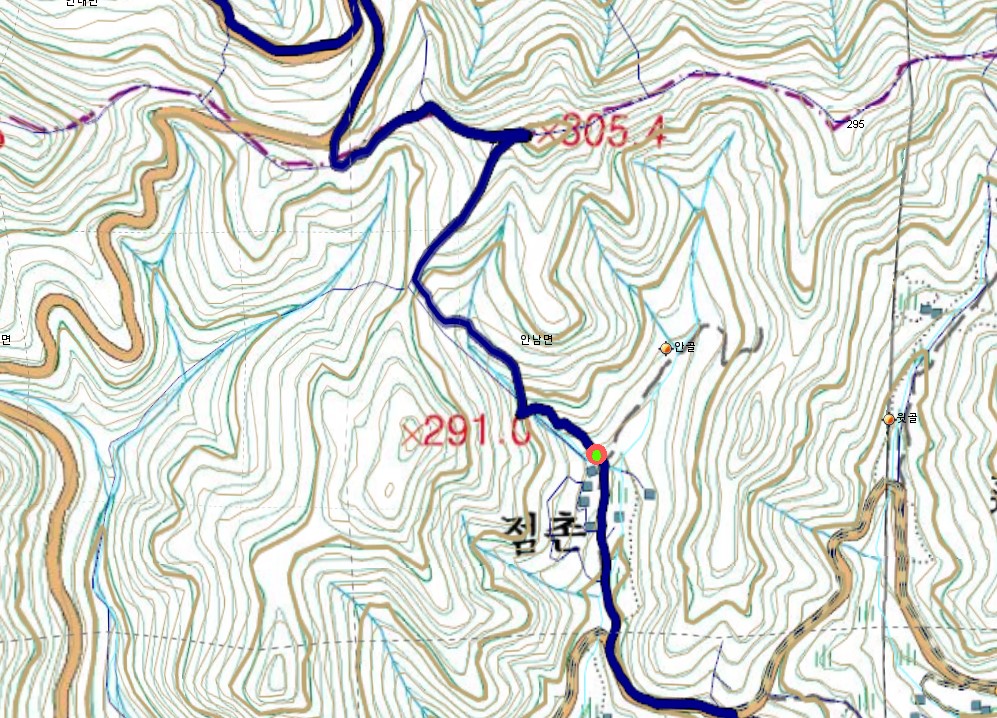 왈왈이(점촌 끝집)지나 291.1봉과 305.4봉 사이 계곡으로 오르는 길이 어지럽다.