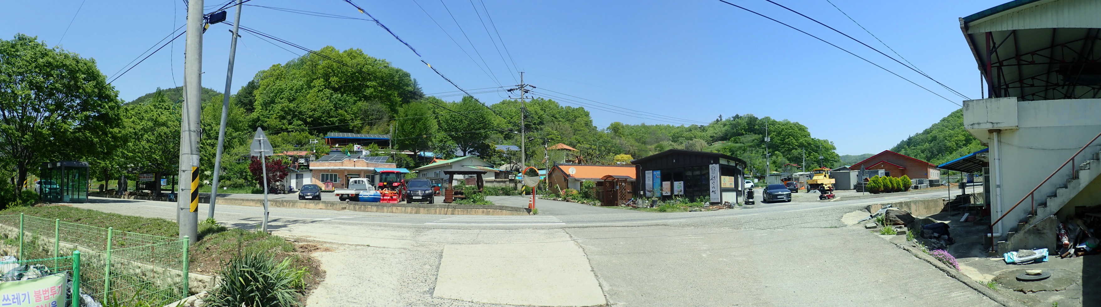 저 앞에 버스정류장이 보인다.
