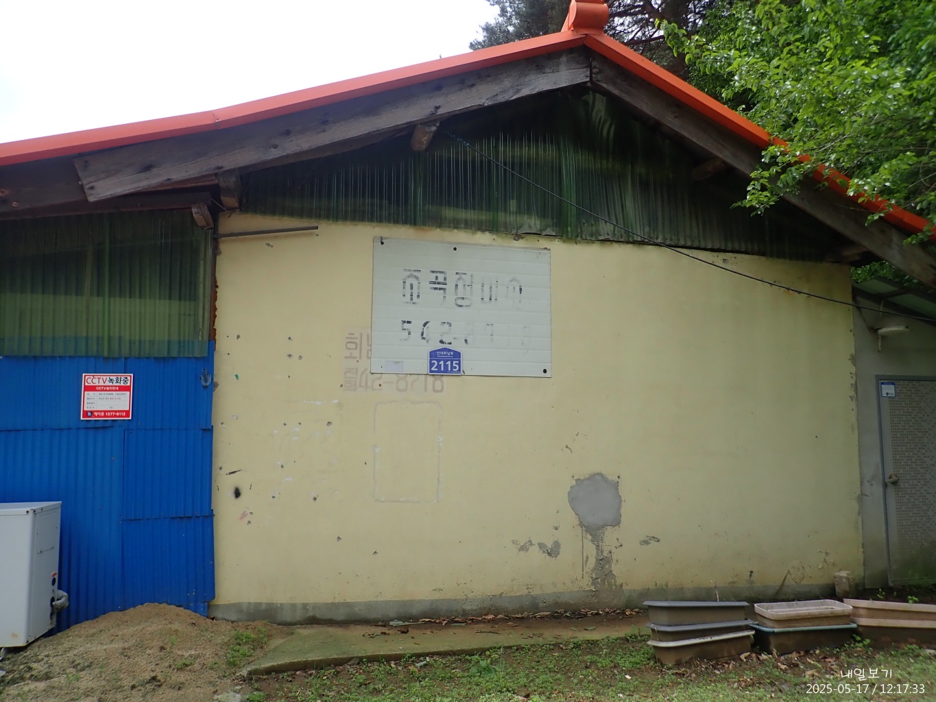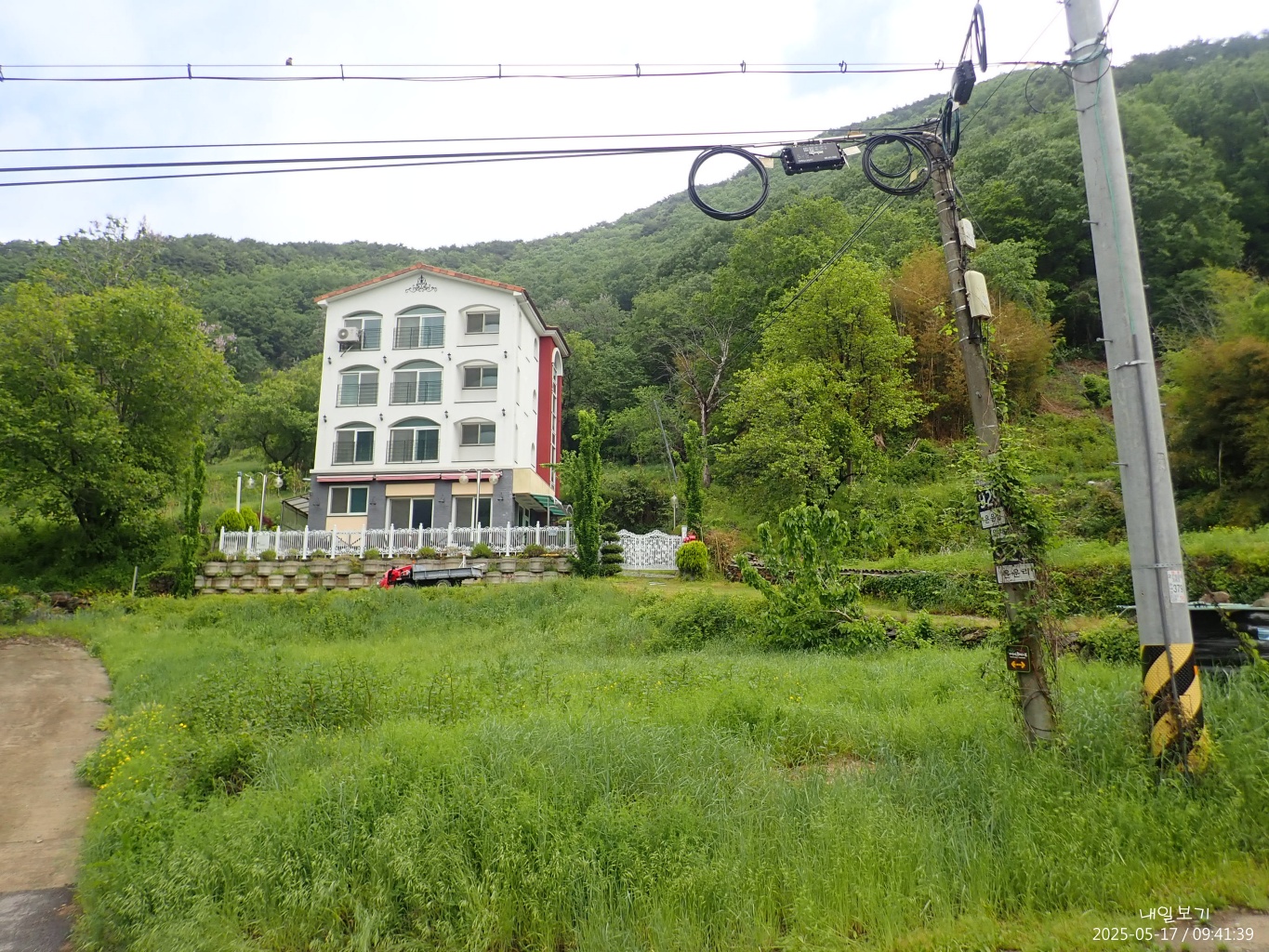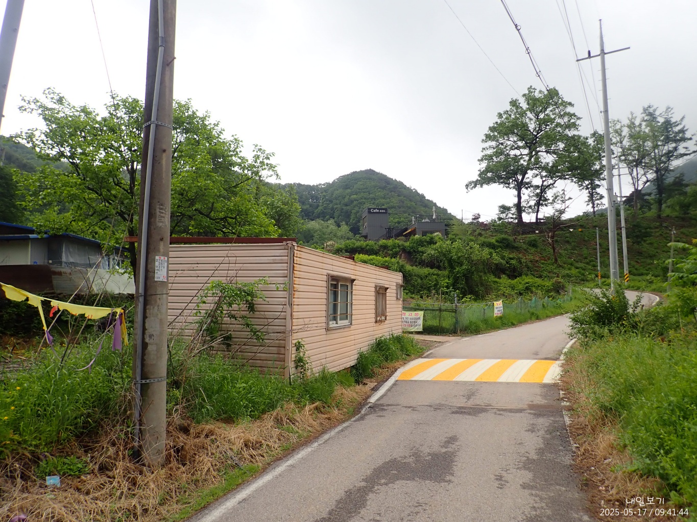 내려다본 은운리카페건물. 건너편 산자락에 기산사가 있겠지.