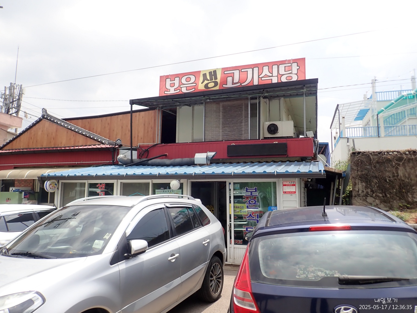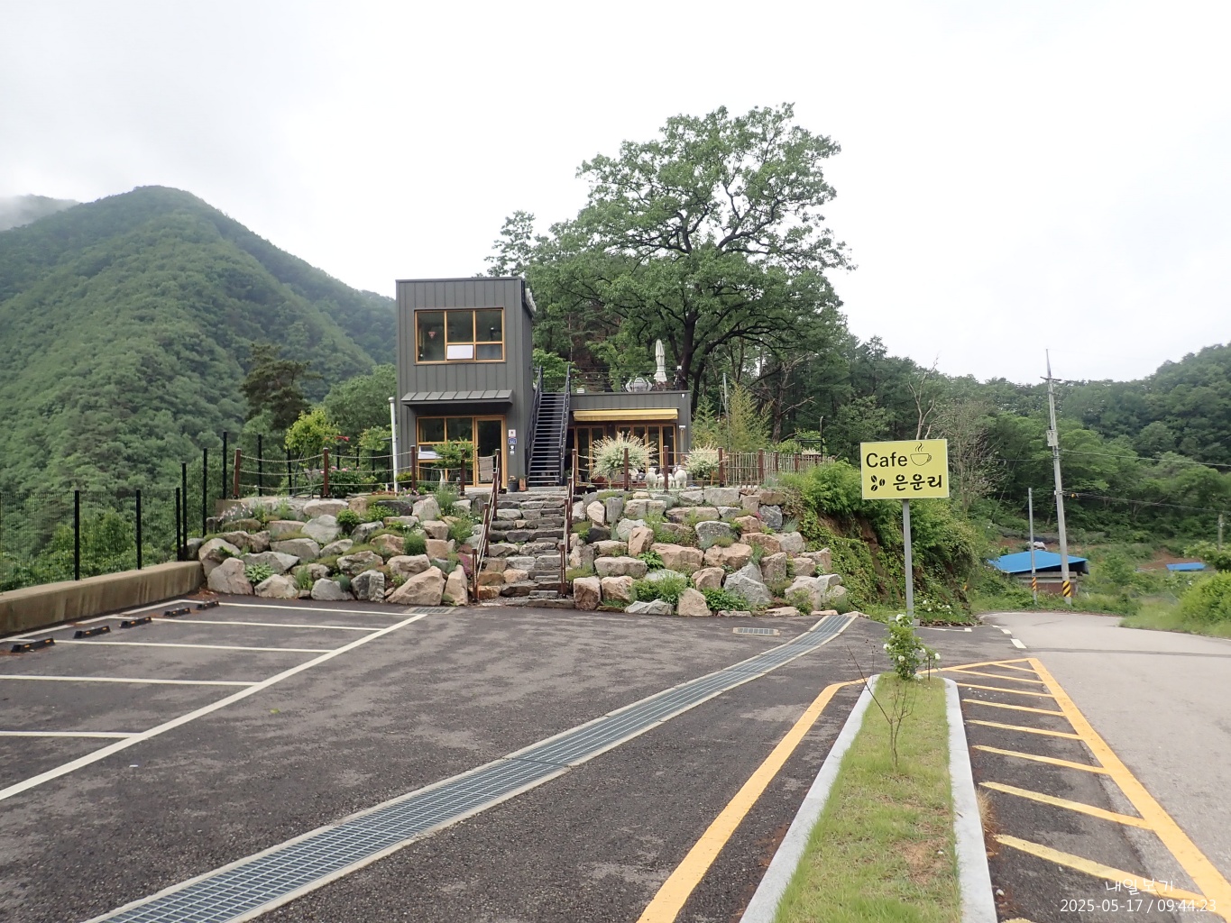 내려다본 은운리카페건물. 건너편 산자락에 기산사가 있겠지.