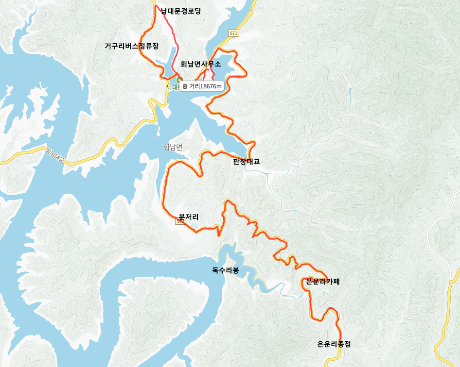 15구간은 보은군으로 회남면사무소에 가면 대전-보은간 63번 버스가 있어 다행인데, 16구간 이후는 대중교통이용이 쉽지 않다.