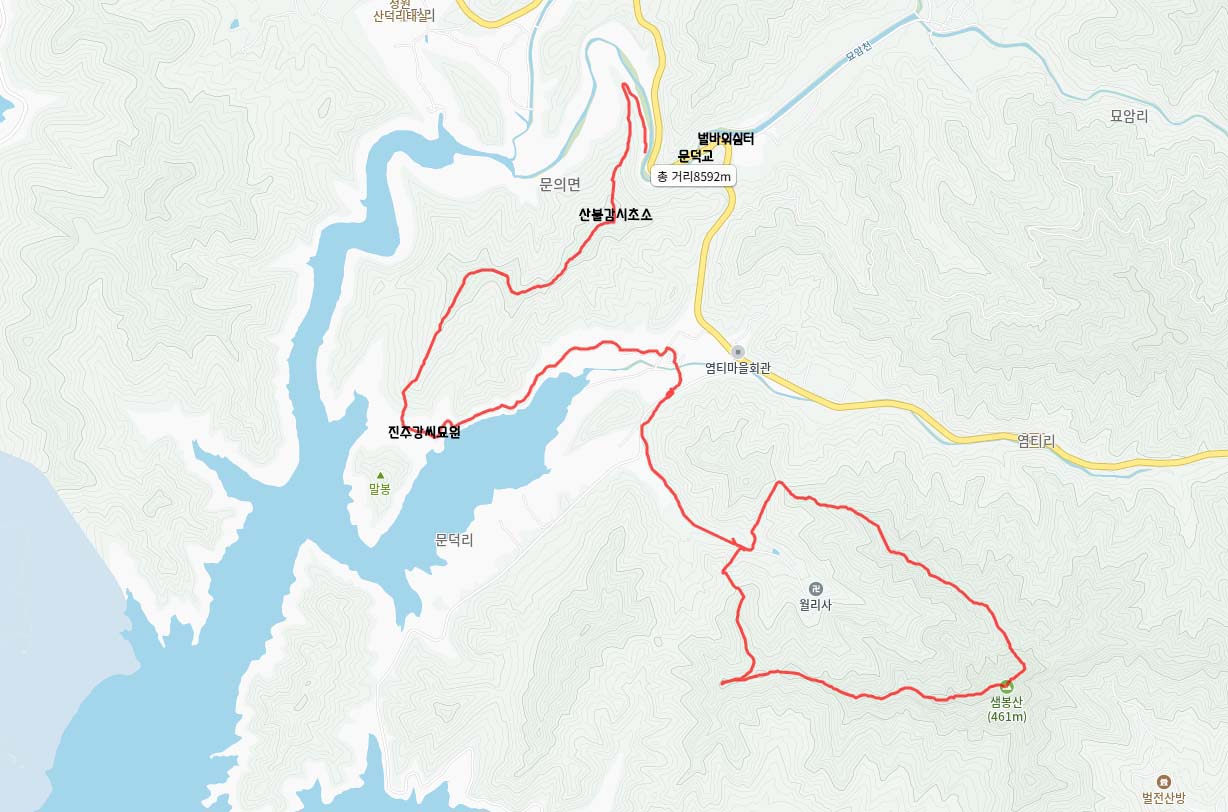 한 바퀴돌고 출발했던 곳으로 내려왔다. 샘봉산은 대청호 오백리길 옆에 있기에 와봤고, 18구간 끝자락 문덕리쪽으로 도로따라.