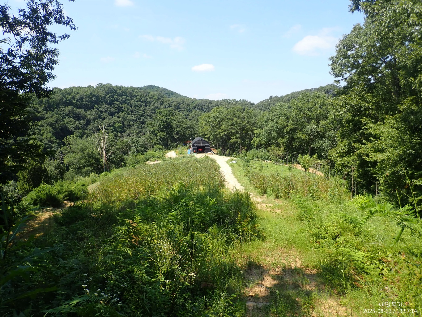 저앞 농장하우스에서 오른쪽으로 진행. 문덕교 북서쪽 계곡에서 마무리.