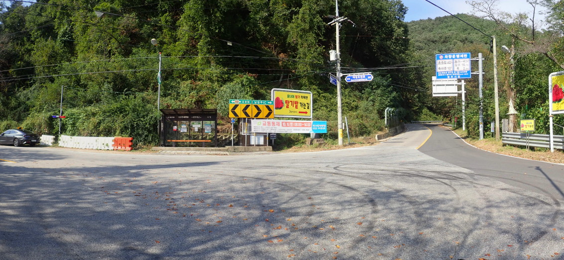 삼거리. 왼쪽 승용차쪽에 21구간 구룡산 들머리.